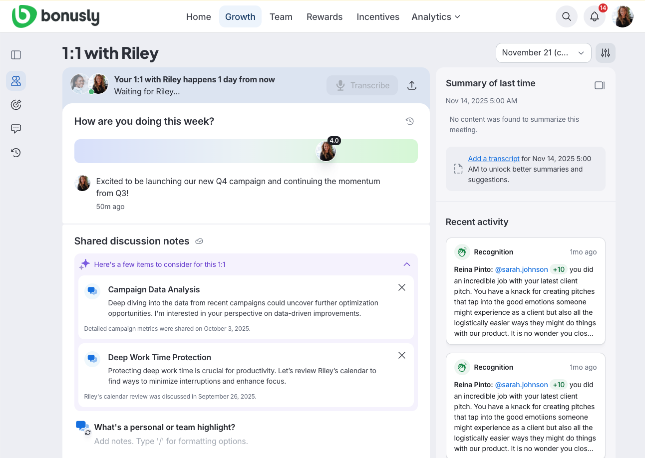 Bonusly | N/A | Bonusly is a continuous performance and employee recognition platform designed to bring recognition, feedback, check-ins, and 1:1s into the flow of work, enabling employees and managers to build consistent performance habits. Core Capabilities Peer Recognition & Rewards: Value-tagged shout-outs with points redeemable for global gift cards, curated physical items, and nonprofit donations. Continuous Feedback: Lightweight prompts and… | $0 per month per user |