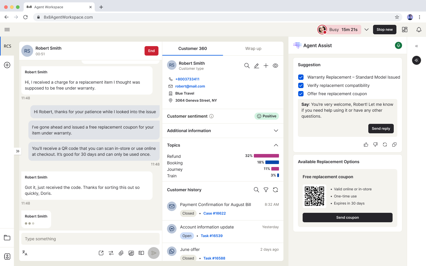 8x8 Contact Center is a cloud-based platform that unifies customer interactions across voice, chat, email, video, SMS, and social. It offers intelligent self-service automation, real-time analytics, and CRM integrations. With omnichannel engagement, agents deliver consistent, personalized service from one interface.