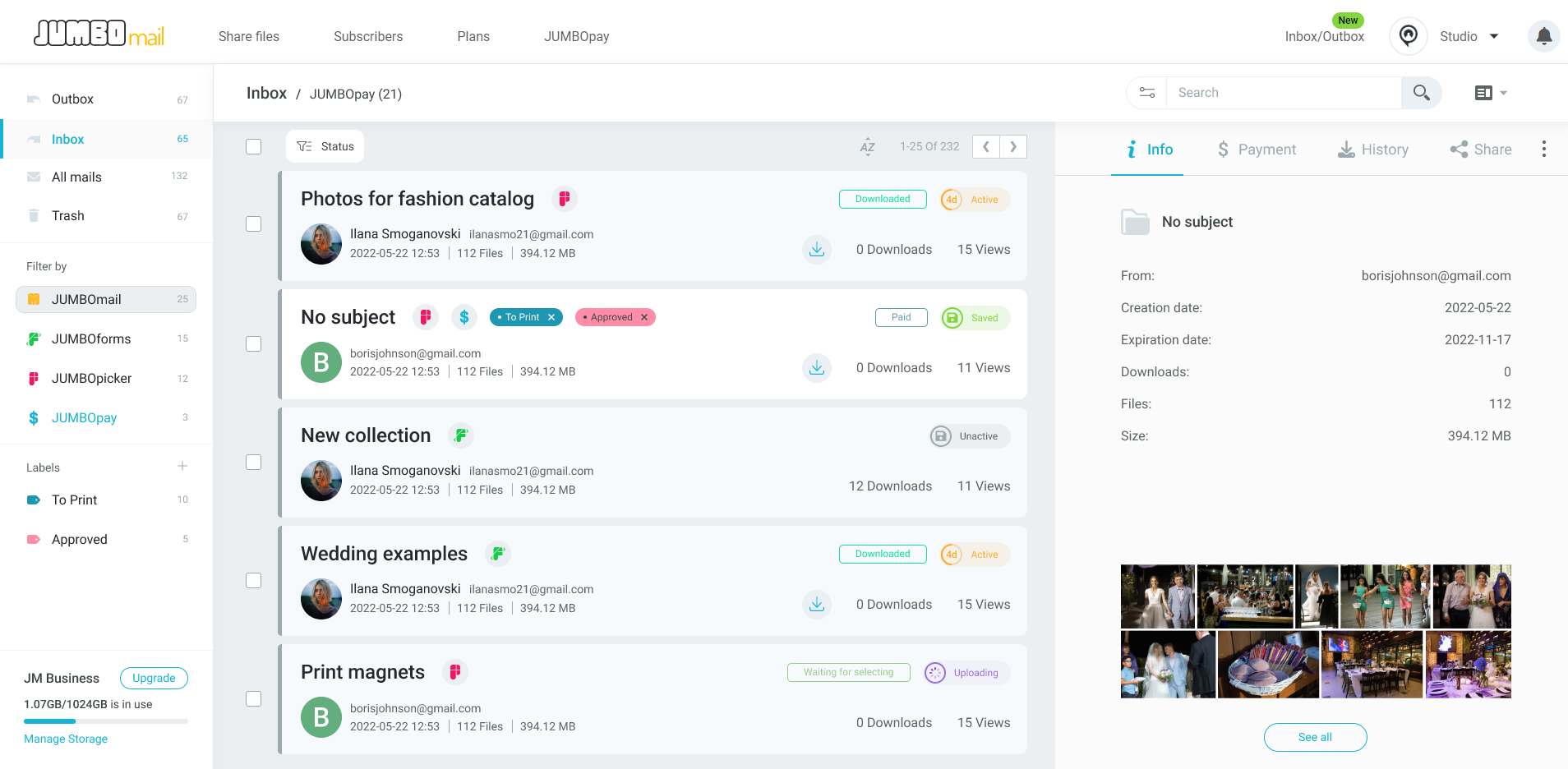 JUMBOmail | N/A | JUMBOmail allows users to send and share XL files up to 20GB. It takes a few clicks to send photos, videos, music, documents, or any type of files to be sent. Select the files or folder to be shared and JUMBOmail will do the heavy lifting. With a branded download page that includes an advanced media gallery preview, JUMBOmail is a file-sharing solution for businesses. JUMBOmail users can track and manage their file transfer & activity on the site. The service is suitable for… | $12 per month |