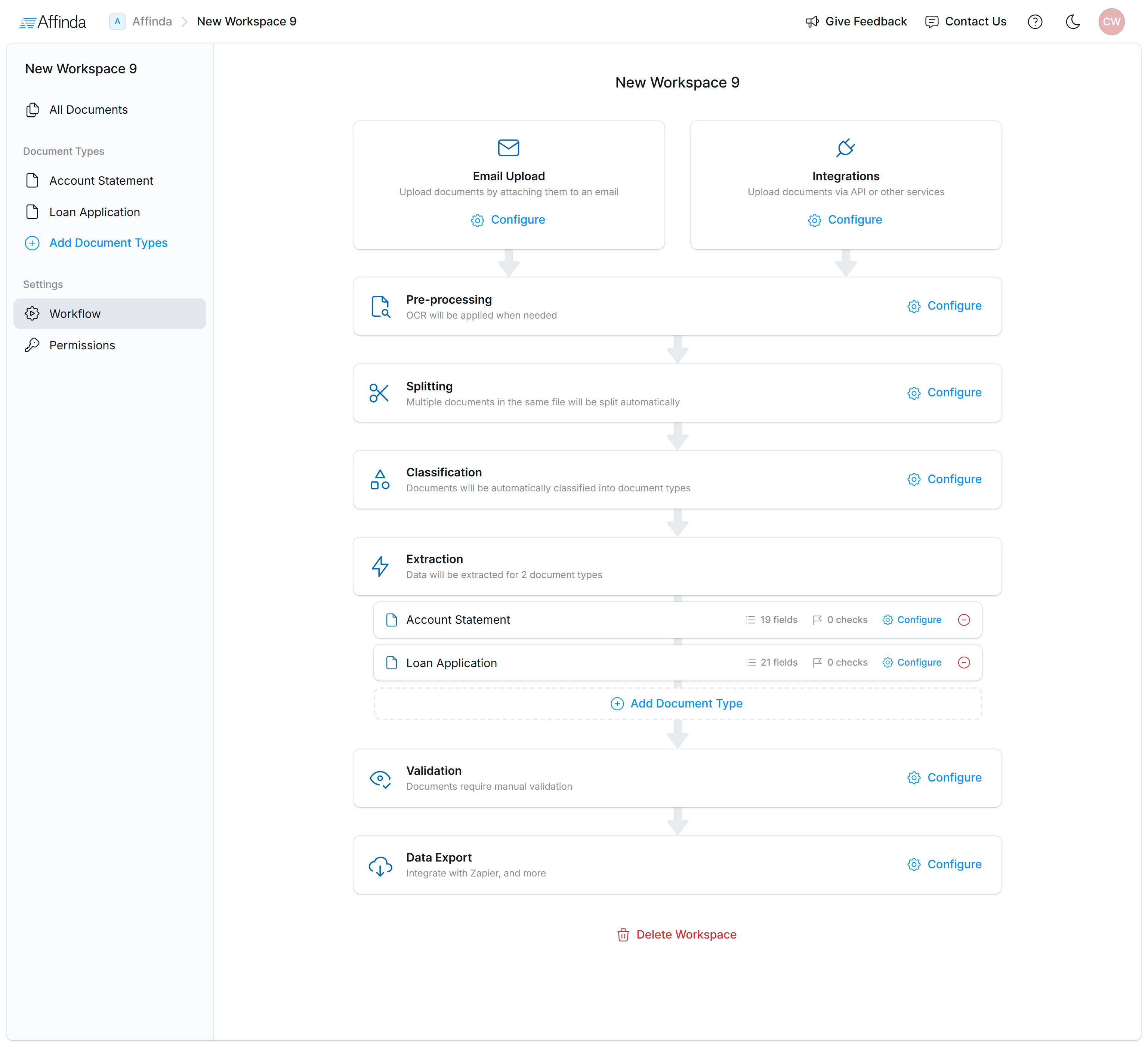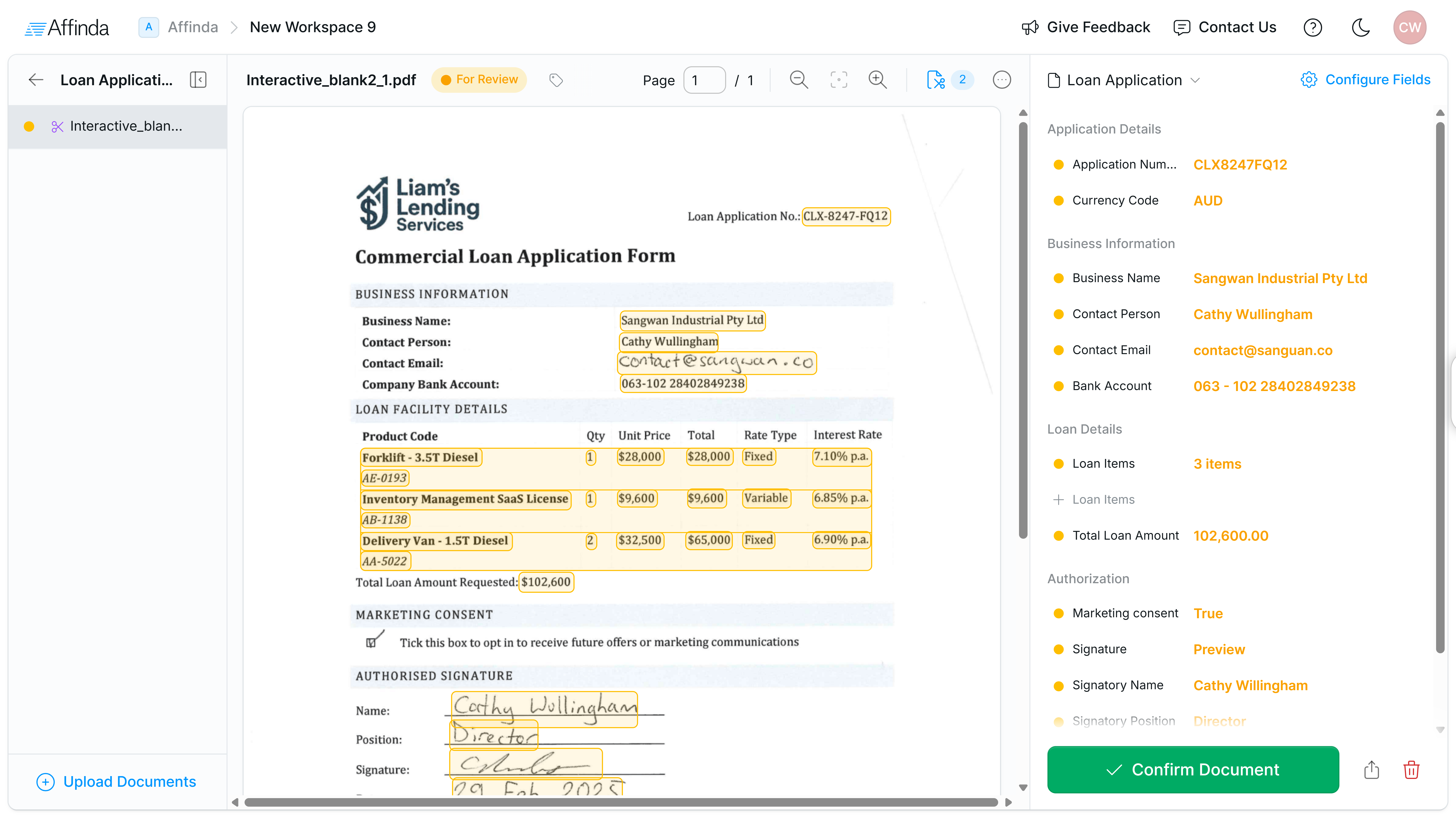 Affinda | N/A | Affinda is an AI document processing platform that learns to process any document type in minutes, helping any organization to shift teams away from manual data entry. Its AI agents extract any data from any document, learning from every interaction to achieve smarter automation without lengthy training cycles. More advanced than machine-learning IDP: Affinda's architecture enables instant learning on new document types and schema changes, minimizing maintenance… | $0.20 per page (pay-as-you-go) | |