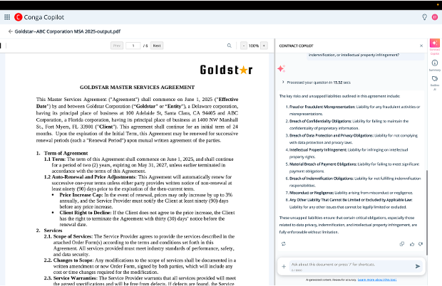 Conga CLM performs reliably across our organization. It handles large volumes of contracts without lag, keeps workflows flowing smoothly, and processes automation tasks efficiently. The system remains responsive, even during busy days, no performance lag.