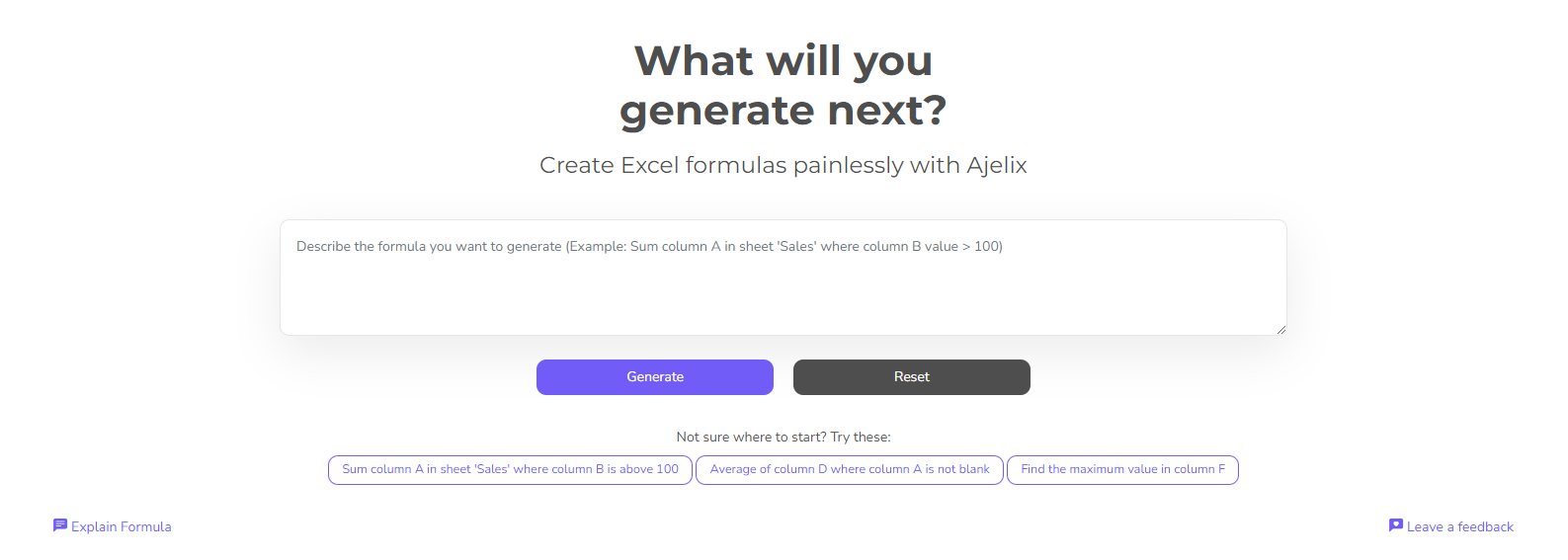Ajelix Excel Assistant | N/A | Ajelix Excel Assistant helps write and explain formulas, translate spreadsheets in 28 languages and write scripts. Excel Assistant helps boost productivity for Excel users by providing assistance without requiring users to waste time searching for information online. Benefits of using Excel Assistant: User dashboard and advanced Excel add-in for the daily workflow. Correct formula syntax. Ajelix Assistant generates formulas with the correct brackets,… | $9.99 per month per user | |