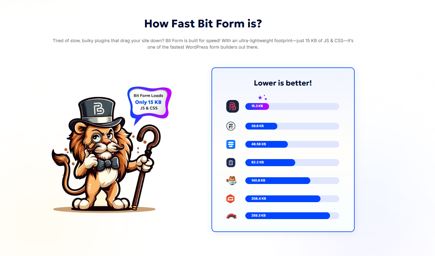 Bit Form | N/A | Bit Form is a WordPress form builder designed for speed, flexibility, and ease of use. The form builder boasts a resource load of just 15.3 KB for JS and CSS, and a set of features for advanced form building. Key Features 45+ Form Fields including Signature, Payments, Repeater, File Upload, and Conditional Fields Multi-Step & Conversational Forms for improved UX and higher conversion… | $29 per year |