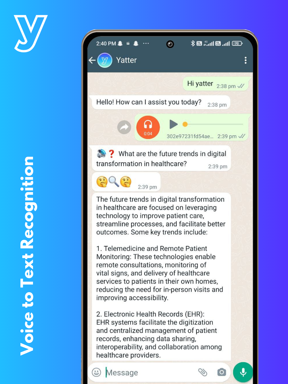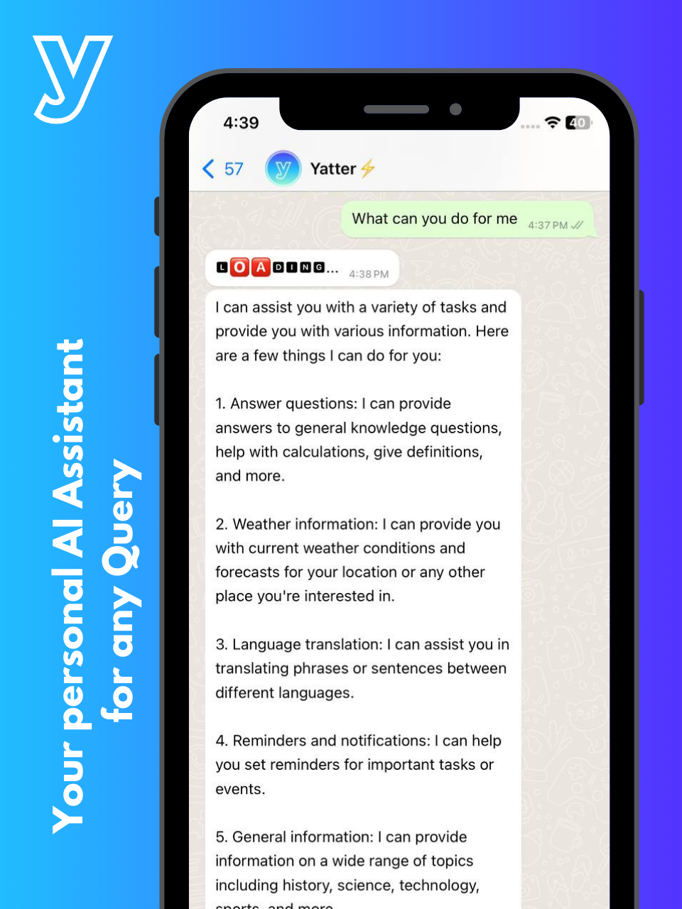 Yatter AI | N/A | Yatter is an AI-powered assistant that integrates with WhatsApp, leveraging the capabilities of ChatGPT-4. It is designed to enhance productivity, streamline communication, and simplify daily tasks. Key features include intelligent conversation capabilities with ChatGPT-4, voice chat messaging, advanced image detection, reminder scheduling, real-time weather updates, quick menu options for frequently used features, multilingual conversations, concise PDF summaries, contextual mindful chats, and… | $9.99 per month per user |