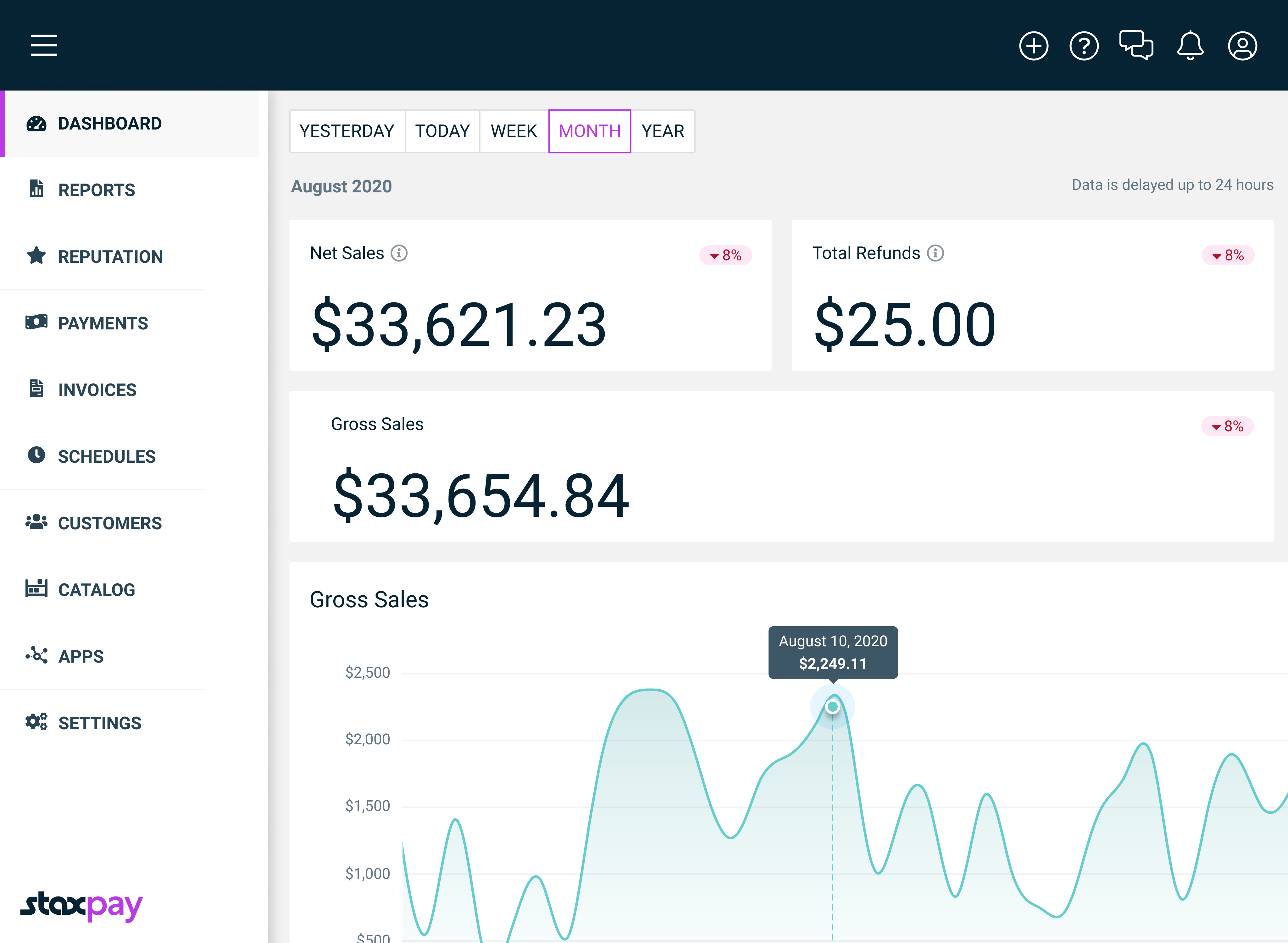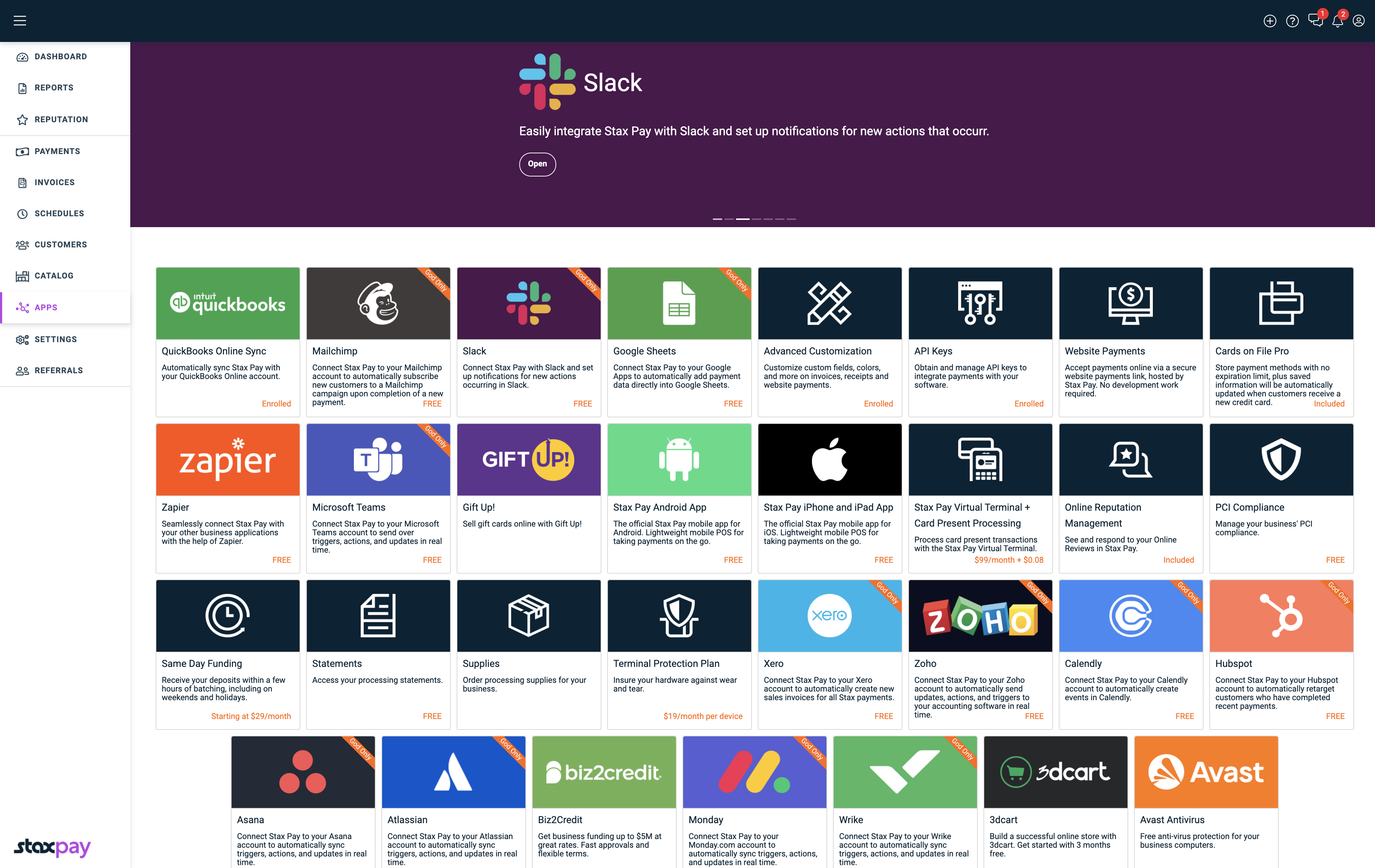 Stax Payments | N/A | Stax is a payment processing solution equipped for in-person, mobile, and online payments. With Stax Pay, SMBs receive access to real-time data and analytics, payment invoicing, financial reporting, and transparent, subscription-based pricing. Stax Connect helps SaaS companies and ISVs integrate embedded payments into their platforms for an end-to-end experience, offering flexible program options, simplified pricing models, and business management tools for partners and their… | $99 per month |
