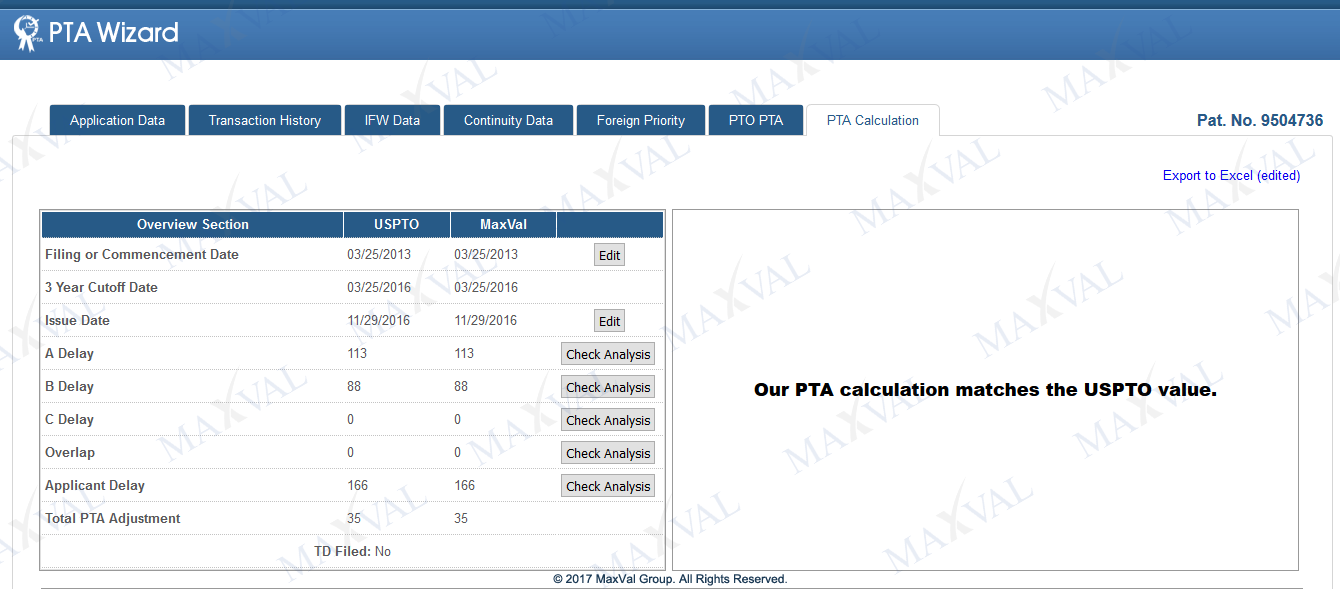 PTA Wizard from MaxVal | N/A | PTA Wizard a tool which enables a user to import a patent number and know/calculate its PTA (Patent term adjustment) value. The tool offers the results in an excel format and the user can also view the data in the tool itself with an editable page, where the user can edit the values if they feel the tool value is incorrect. So the user can perform / change calculation using edit option. Also the tool gives the PAIR details of a patent for which the user requested a PTA. Tool allows… | N/A |