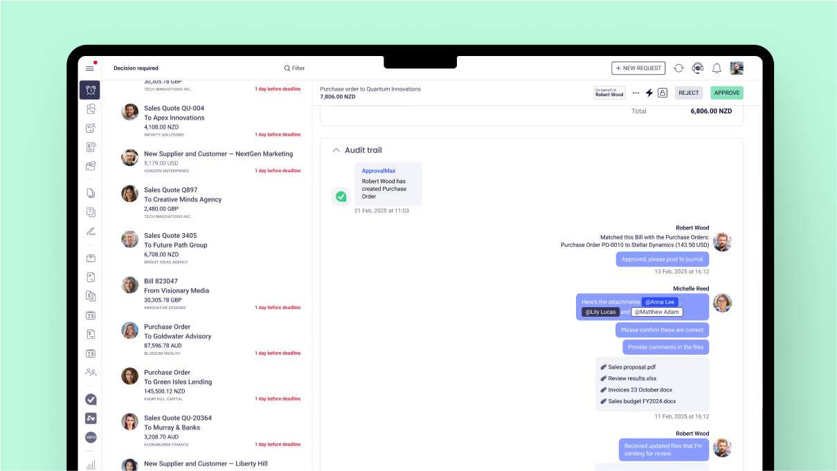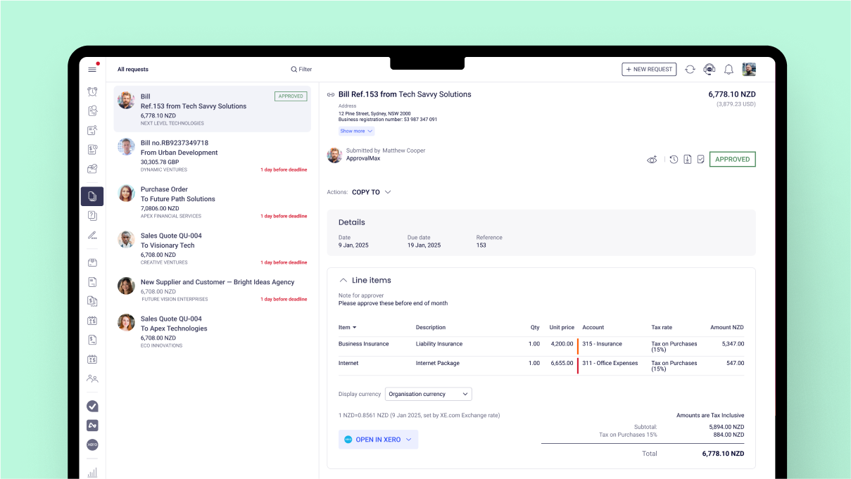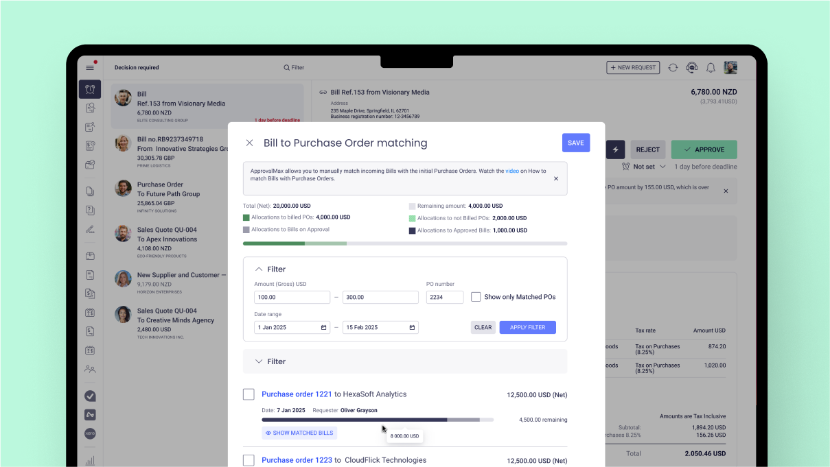 ApprovalMax | N/A | ApprovalMax provides approval workflow automation for cloud accounting platforms such as Xero and QuickBooks Online. It replaces paper- and email-based approval processes with multi-step and multi-role automated approval workflows that enable automated notifications to approvers, automated audit trails, and mobile approvals. Approval workflows include: Invoice approvals / bill review and bill approval Purchase order approval, including the functionality to create… | $54 per month | |