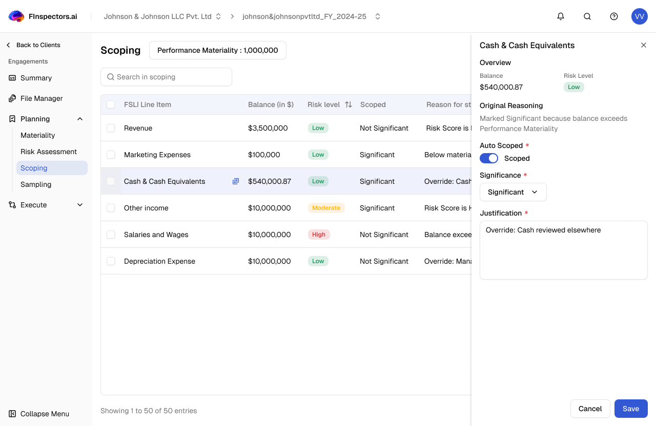 Finspectors | N/A | Finspectors is an audit automation and risk analysis software platform used to review general ledger data, validate supporting documents, and execute audit procedures. It analyzes exported ledgers, vouchers, day books, trial balances, and journal entries to surface transactions requiring examination. | $29 per month per user |