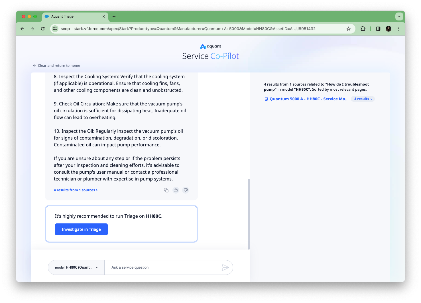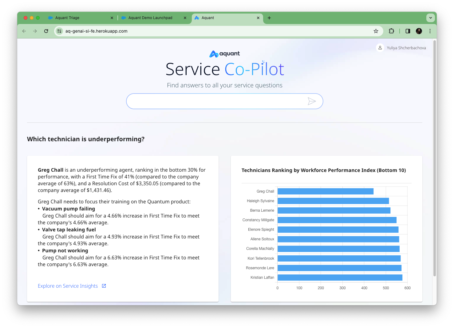 Aquant Servie Co-Pilot | Enterprise companies (1,001+ employees) | Aquant Service Co-Pilot is a diagnostics and troubleshooting tool used to troubleshoot and triage even the most complicated equipment problems. With a fully guided experience, it is designed to enable users to the root of the problem quickly and implement the best possible fix, and to investigate, access relevant assets, find suggested parts, or escalate with just a few clicks. Service Co-Pilot continuously refines its capabilities by learning from real-world service data, expert insights,… | N/A | |