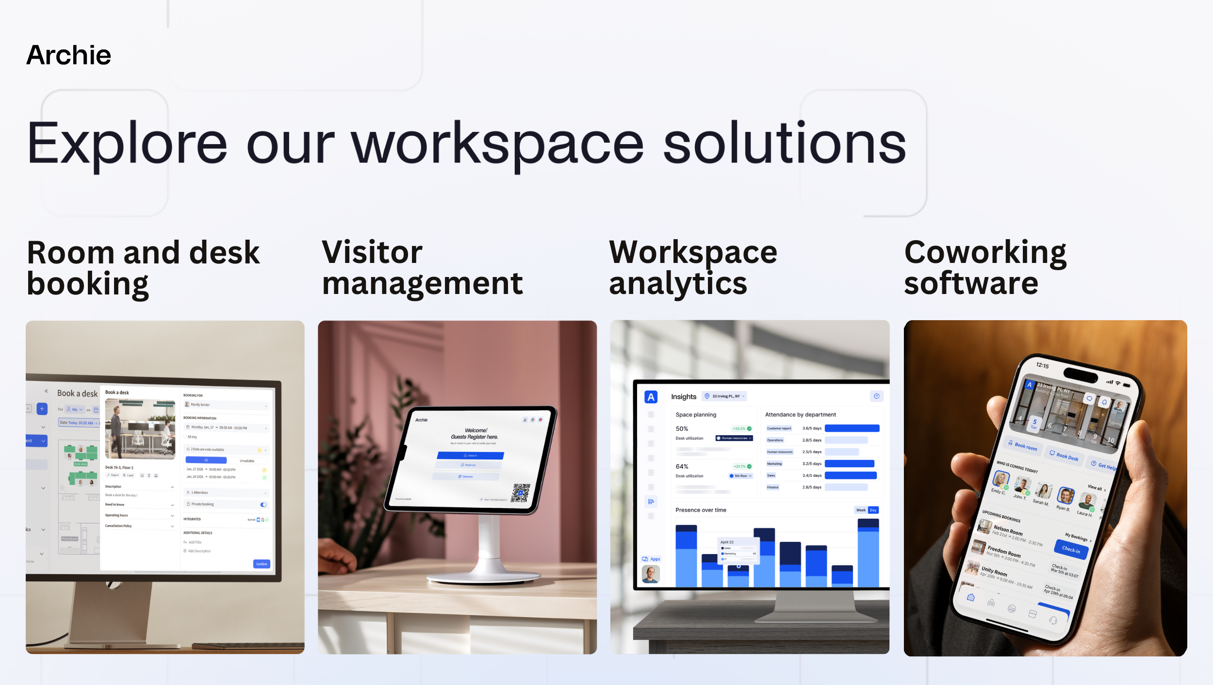Archie | Mid-Size Companies (51-1,000 employees) | Archie is a solution for offices and shared workspaces around the globe, offering a suite of tools including meeting room and desk booking, visitor management, coworking management software and workspace planning and analytics. The solution is tailored to all organizations, from small businesses to large enterprises, and the feature set includes: visual floor plans, employee lookup, visitor logs, check-in and check-out tracking, meeting room scheduling, desk booking, seat… | $159 per month | |