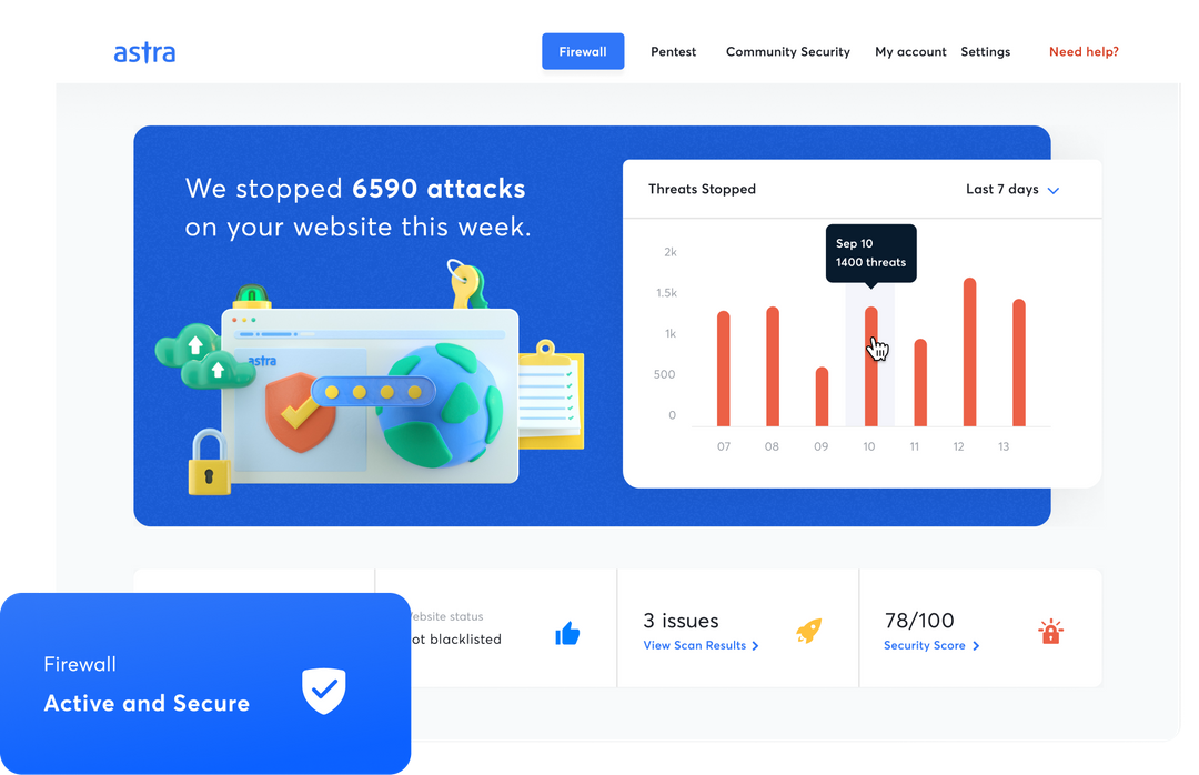 Astra Website Protection | N/A | Astra is a security suite for websites. Astra protects users against malware, credit card hack, RCE, SQLi, XSS, SEO spam, comments spam, brute force & 100+ types of threats. Astra offers a 24*7 active Web Application Firewall to protect stores in real-time, on-demand machine-learning powered malware scanner,, Vulnerability Assessment & Penetration Testing (VAPT), IP blocking, country blocking, login activity, file upload rules, and several other features to provide 360° protection to… | $25 per month per installation | |