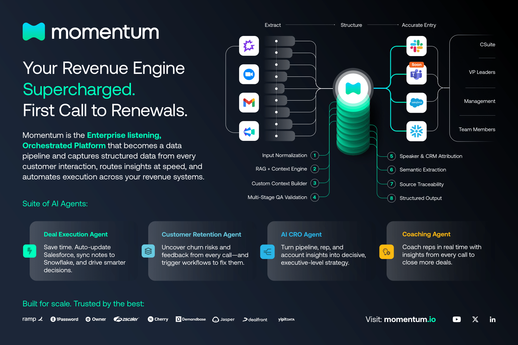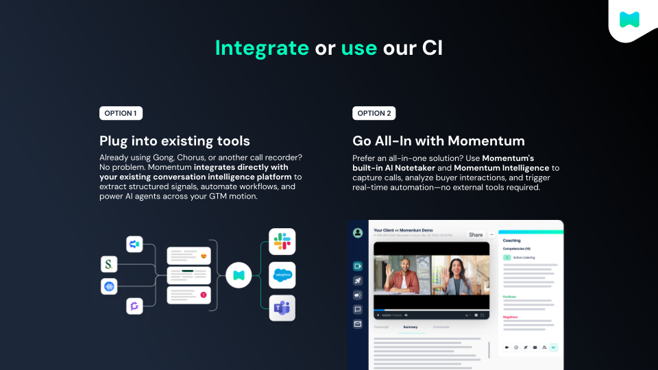 Momentum.io | N/A | Momentum is a no code platform to automate sales workflows. Embedded into existing sales-first tooling, from Slack and Salesforce to Asana and Outreach, Momentum's access gives revenue team the building blocks to operationalize sales motions. | $828 per year per user |