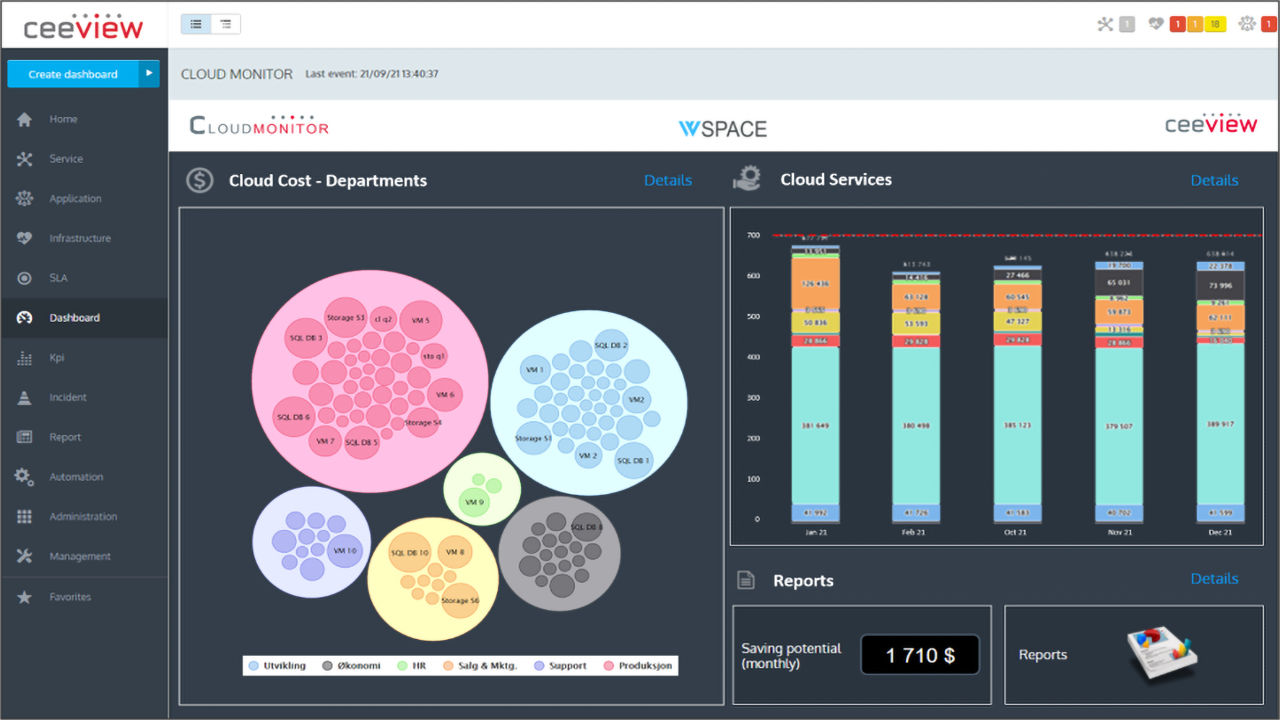 Ceeview Cloud Cost & Budget Monitoring | N/A | Ceeview Cloud Cost & Budget Monitoring is a tool that gives users a clear view of their cloud costs and resource utilization in order to help them control expenses and optimize their cloud environment. It allows users to avoid budget overruns, monitor resource usage, predict future costs, and monitor the health of their cloud environment. Additionally, Ceeview Cloud Cost & Budget Monitoring provides users with dashboards and notification features to help them stay on top… | N/A |