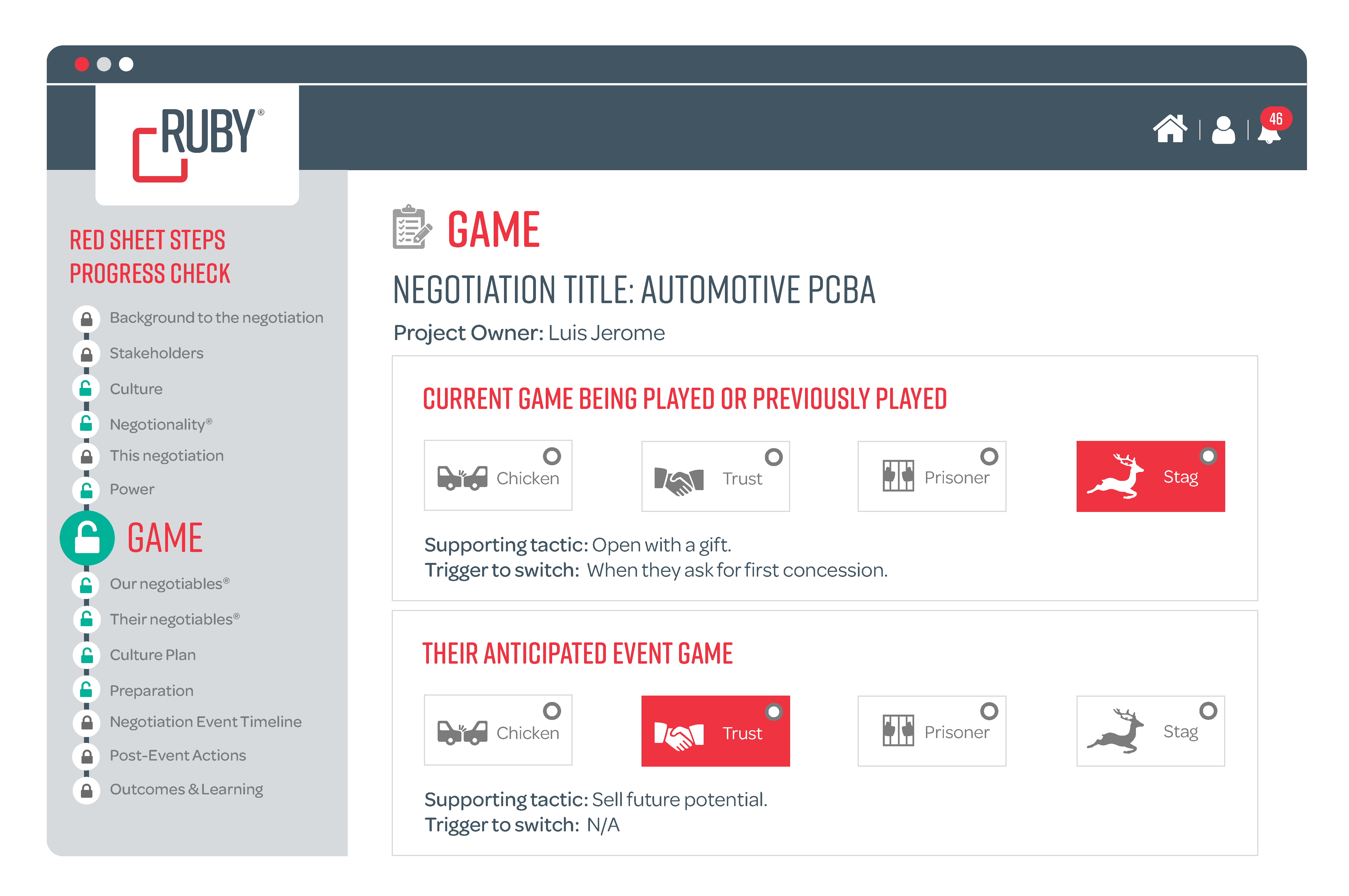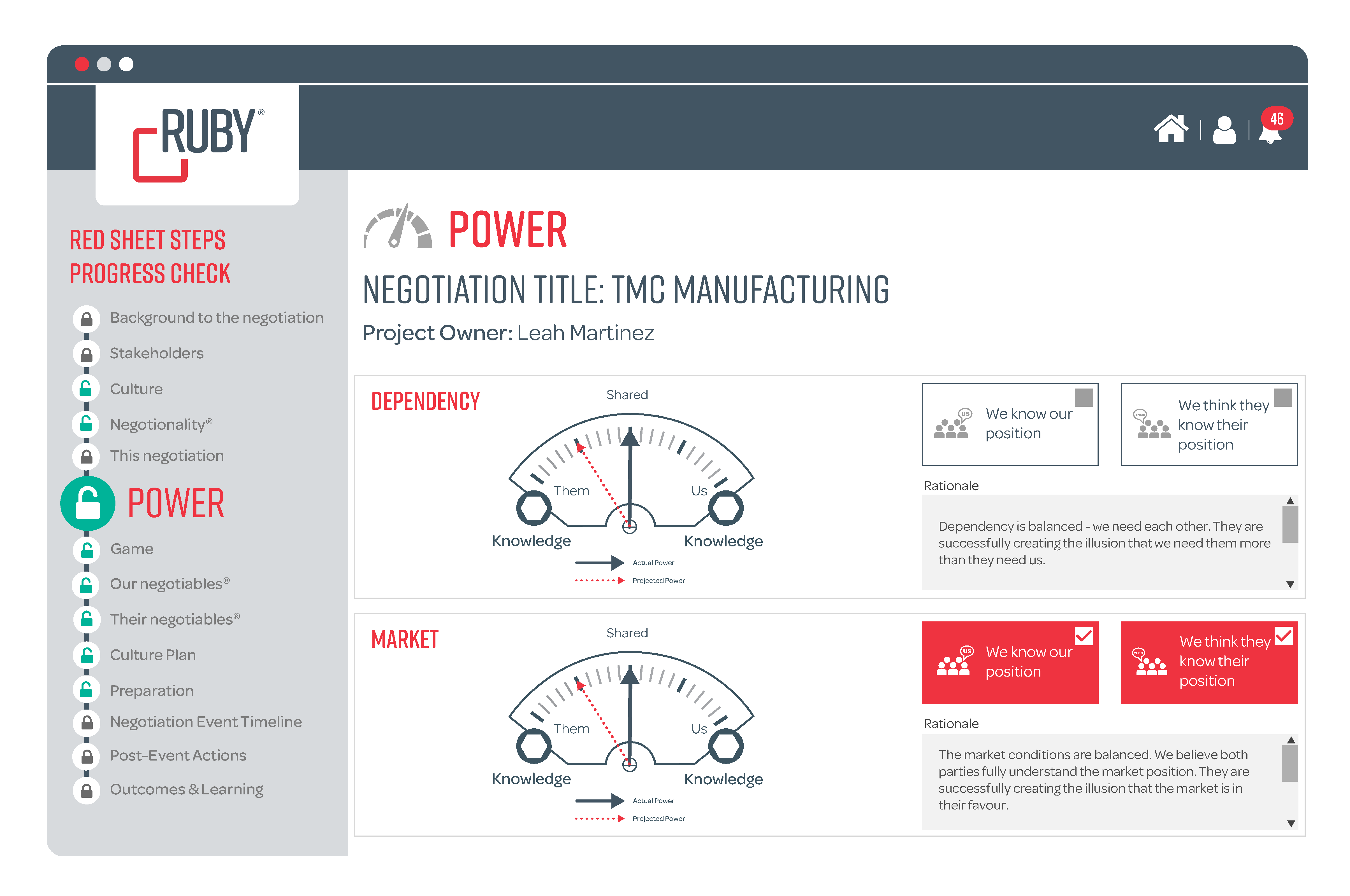 Ruby - The Guided Negotiation Plan Creator® | N/A | Built upon the Red Sheet® negotiation methodology, Ruby guides users towards creating winning negotiation strategies. With a management dashboard and built-in collaboration features, globally dispersed teams can work together to create effective negotiation plans. Ruby becomes the team's expert negotiator, ensuring nothing is left on the table. Ruby helps users research, plan and prepare for a negotiation, with custom roleplay and the ability to generate characters to… | N/A |