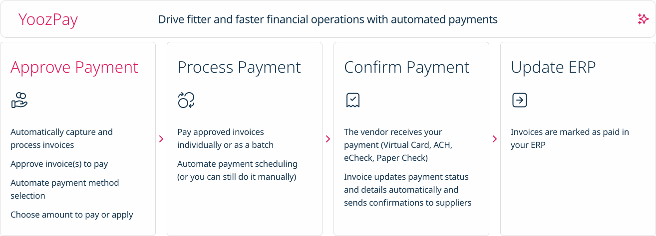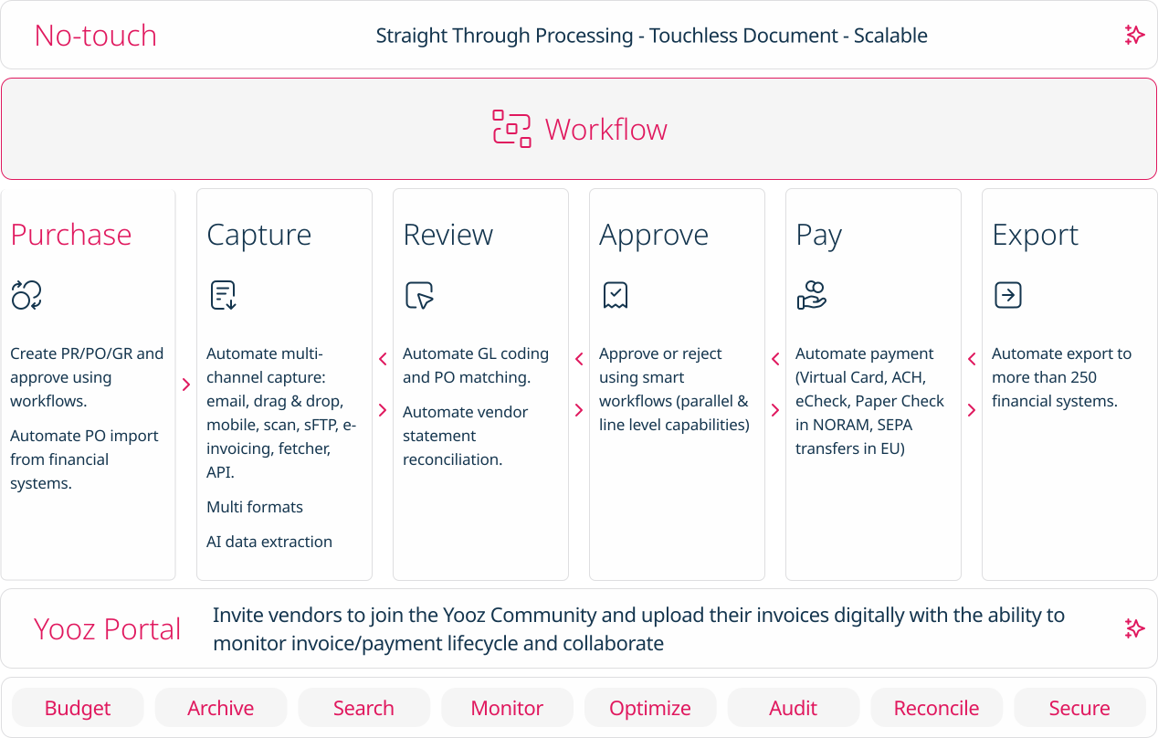 Yooz | Small Businesses (1-50 employees) | Yooz delivers intelligent financial operations automation that aims to reduce waste, mitigate risk, prevent fraud, and eliminate errors from the AP process. Yooz provides Lean Financial Operations™ for companies of all sizes, offering clarity and control in the most complex environments. The Yooz platform combines a workflow engine, real-time applied AI, and transparency, with advanced fraud detection. Boasting over 7,000 customers worldwide and processing more than 300 million… | N/A |