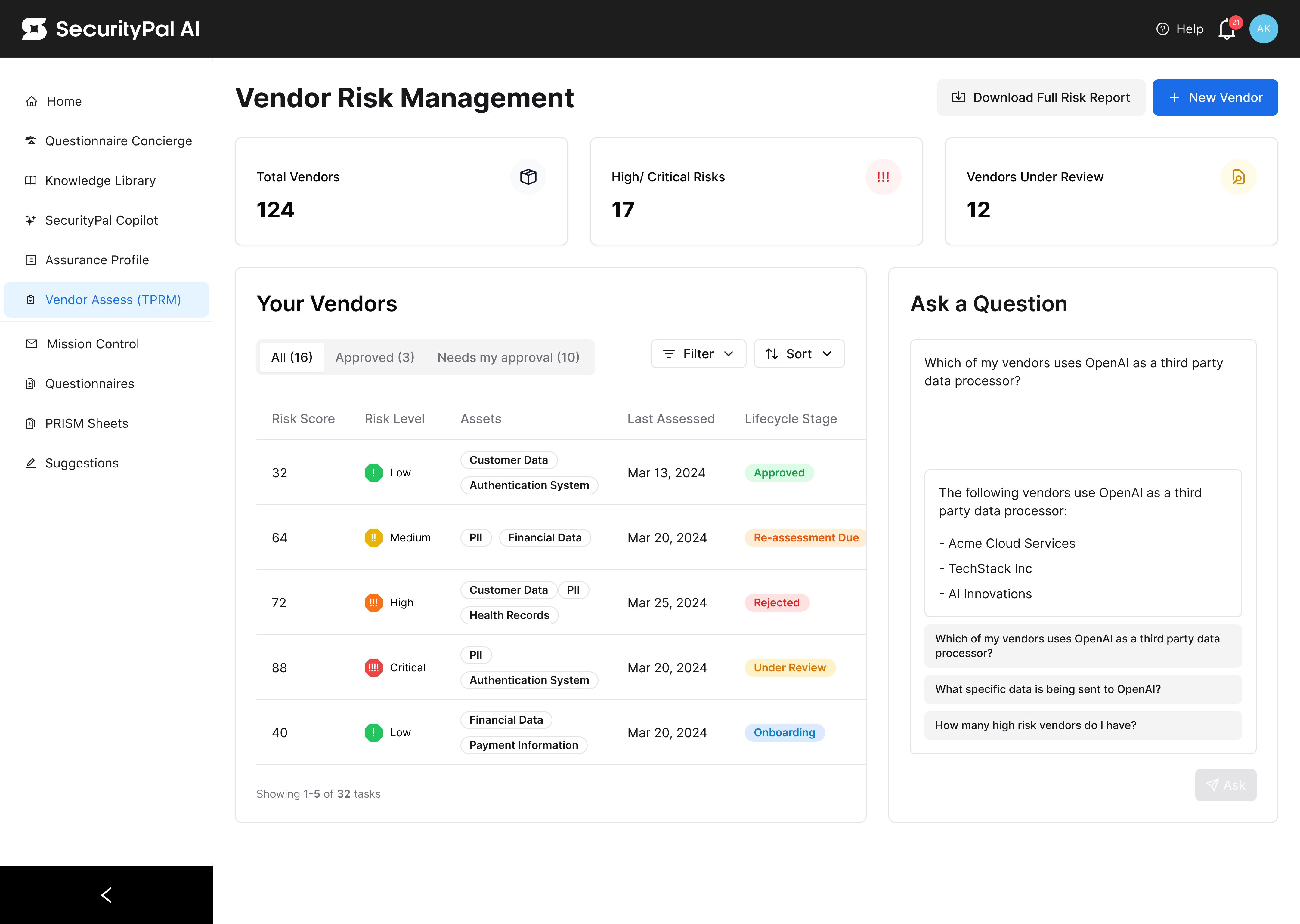 SecurityPal | N/A | SecurityPal is an Assurance Management Platform that helps organizations automate and scale trust. Powered by AI Agents and backed by certified security experts. | N/A |