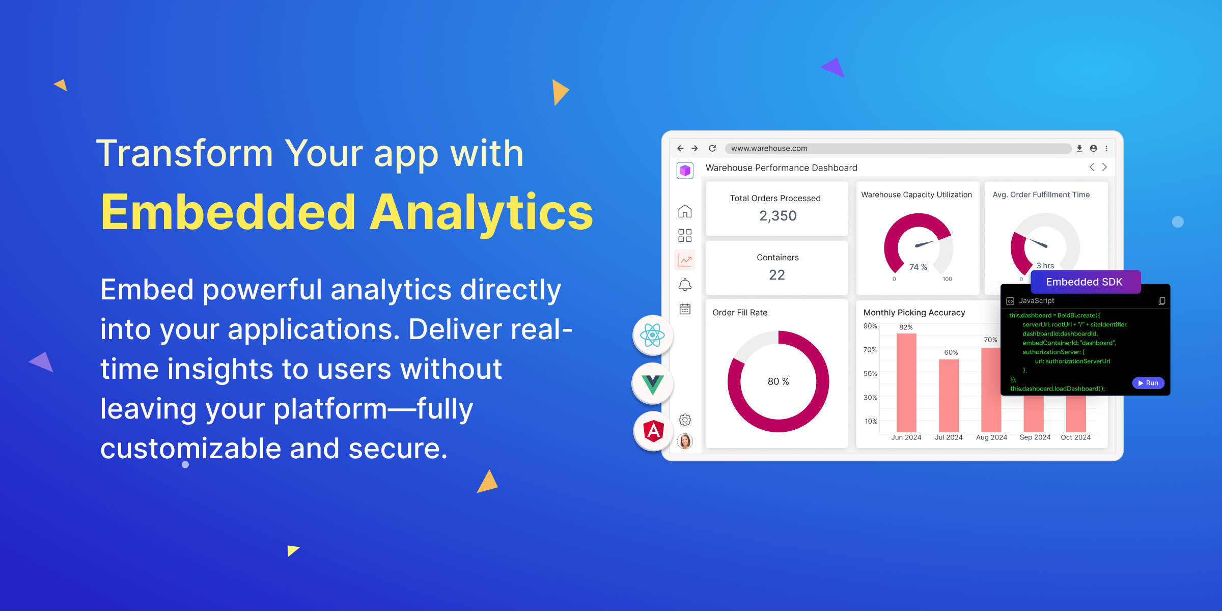 Bold BI®, by Syncfusion® | N/A | Bold BI, from software components and app development specialist Syncfusion, is designed with rich customization options to make the embedding process easy. The vendor states users can embed Bold BI into enterprise software to bring a powerful analytics platform right into apps. | $0 per year per user | |