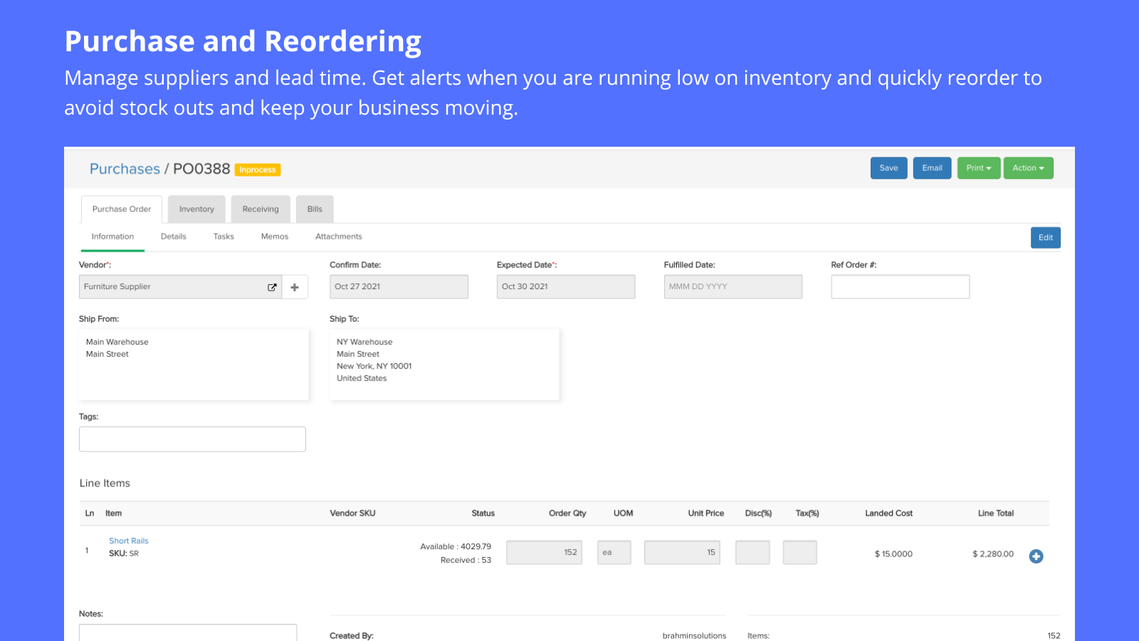 Brahmin Solutions | N/A | Brahmin Solutions offers their order management solution, designed to make it easy to manage and fulfill orders. Brahmin Solutions Inventory control software will help gain visibility across online channels and warehouses. Avoid stockouts by maintaining products and their inventory levels from one central location. Brahmin Solutions warehouse management software makes it easier to manage stock across multiple locations and warehouses from one central location. | $129 per month per user | |
