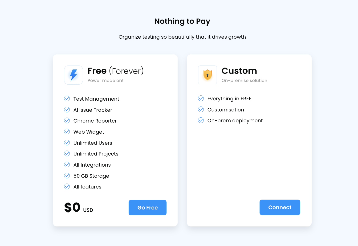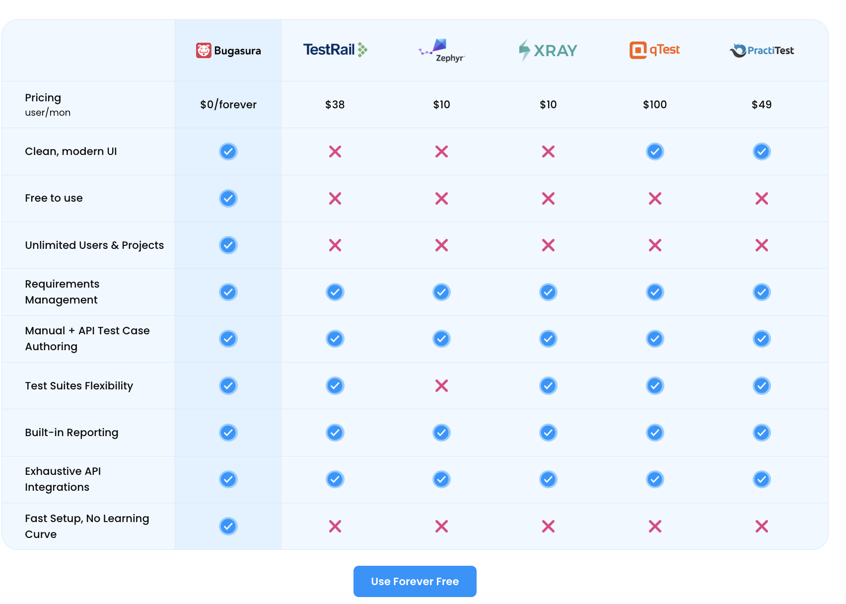 Bugasura | Small Businesses (1-50 employees) | Bugasura is a test management platform designed for teams that brings test cases, test runs, bugs, and insights into one flow. It helps teams test faster, report smarter, and stay connected across product, QA, and engineering. The platform automatically links bugs with test cases, captures test data and device context, and helps teams see patterns that would otherwise go unnoticed. Bugasura integrates with tools like Jira, GitHub, Slack, and Gmail, and… | $0 per month per user | |