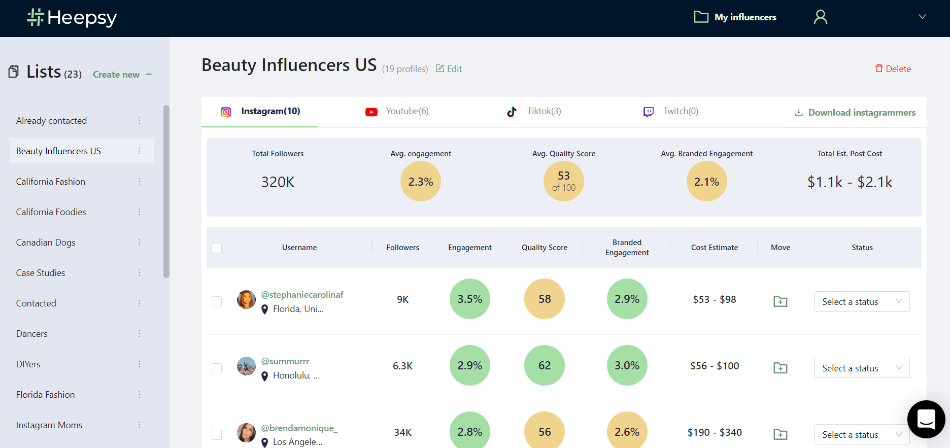 Heepsy | N/A | Heepsy is an influencer marketing platform for brands and agencies. Heepsy gives access to millions of influencers from around the world, plus the tools needed to find the right one for a brand. 🔎 Search for influencers on Instagram, YouTube, TikTok, and Twitch with filters that help find influencers faster. Search by: Location Category Follower count Engagement rate Contact info and social… | $49 per month |