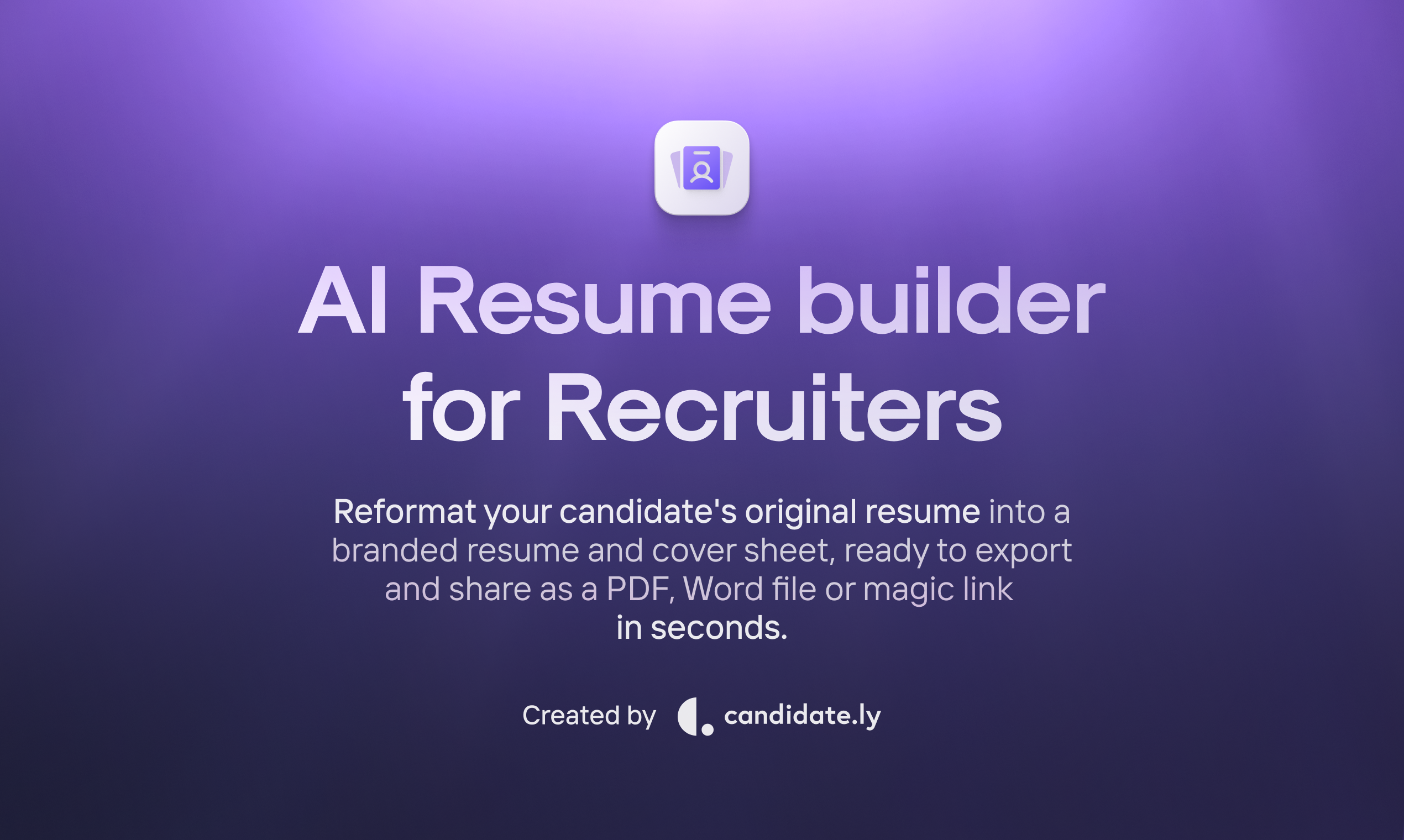 Candidately | Small Businesses (1-50 employees) | Candidately's AI Resume Builder streamlines resume formatting for recruiters and staffing agencies by turning original CVs into branded documents in seconds. Key features include anonymization, customizable designs, AI-generated summaries, and ATS integration such as Bullhorn. The solution is used to boost recruiter efficiency, ensure brand consistency, and deliver polished resumes that impress clients faster. | $1 one-time fee Per Resume Export | |
