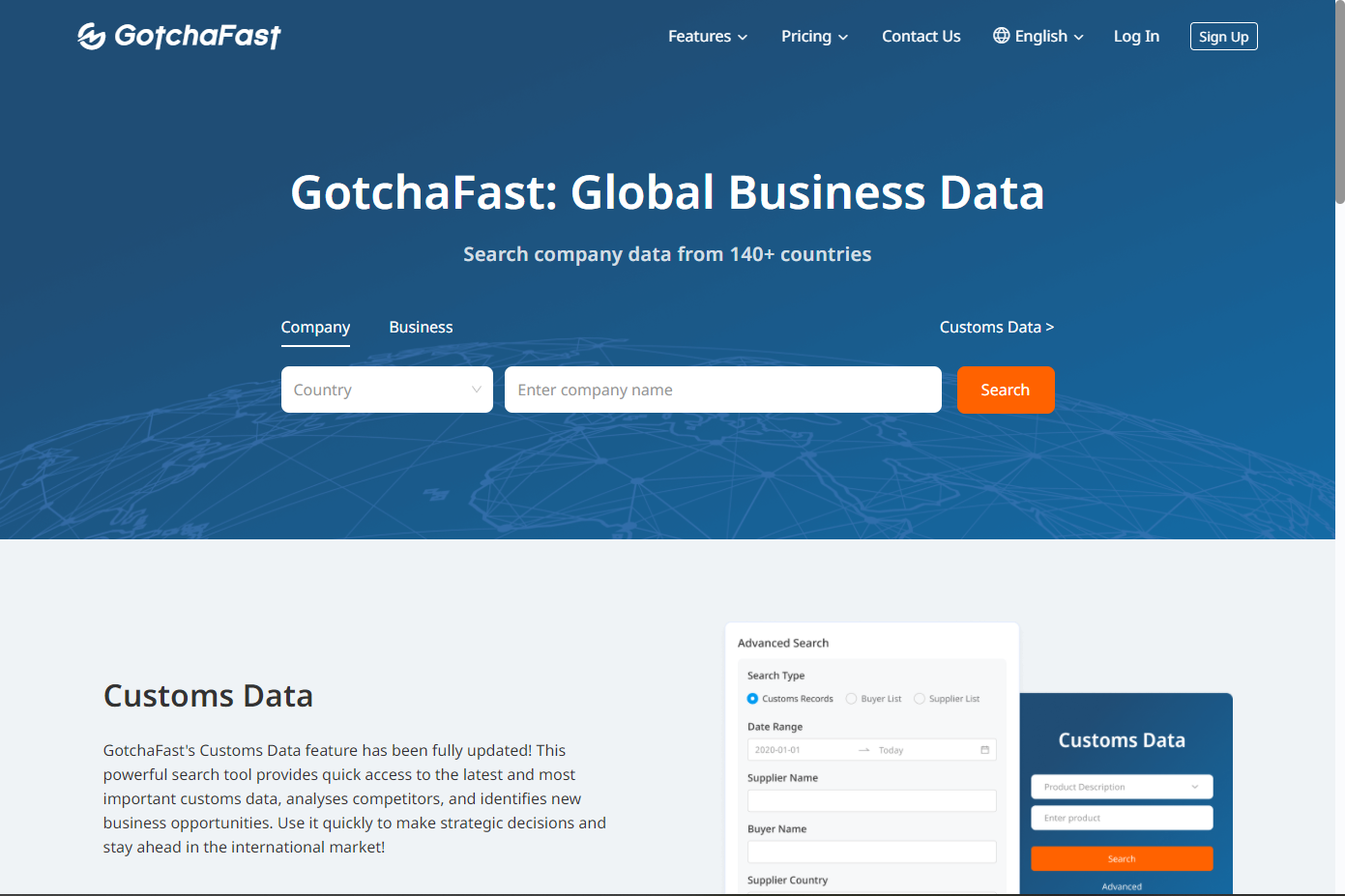 GotchaFast | Small Businesses (1-50 employees) | Gochafast helps companies build their international business with multi-dimensional company data searches, as well as customer development tools. The Customs Data Search tool in GothaFast provides access to import and export records. This data is valuable for identifying potential buyers, understanding market trends, and analyzing competitors' activities in the global market. | $39 per month |