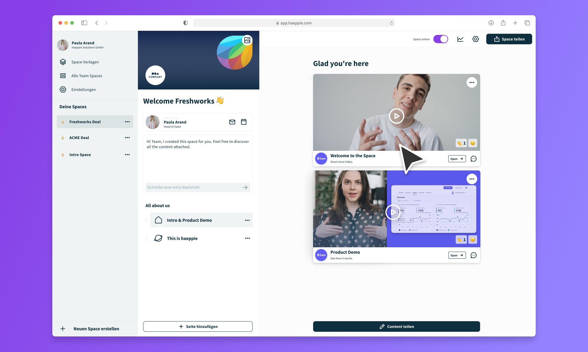 Haeppie Sales Space | N/A | haeppie is software for Sales and Customer Success Teams, used to create personalised and interactive Spaces that close more deals and accelerates the sales cycles from cold outreach through to onboarding by centralising buyer journeys with one link. | $45 per month per user |