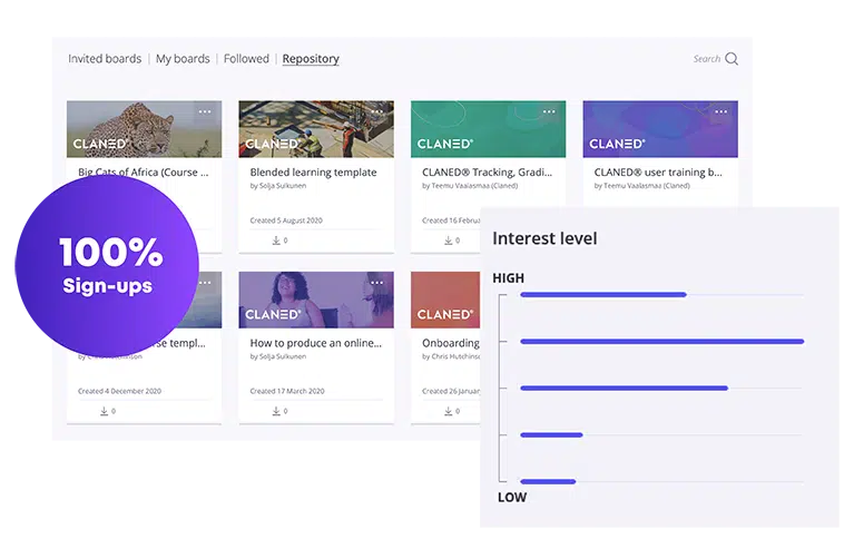 Claned | N/A | Claned learning environment measures the current knowledge capital of learners and compares it to the strategic skills and competences needed in the future. Claned can build engaging, personalized learning paths to learners to help them achieve strategic skills. Its machine learning algorithms gather data from interactions on the platform automatically and in real time providing visibility into learning activities and their progress. In this way CLANED can measure the impact of competence… | $196 per year 50 Users | |