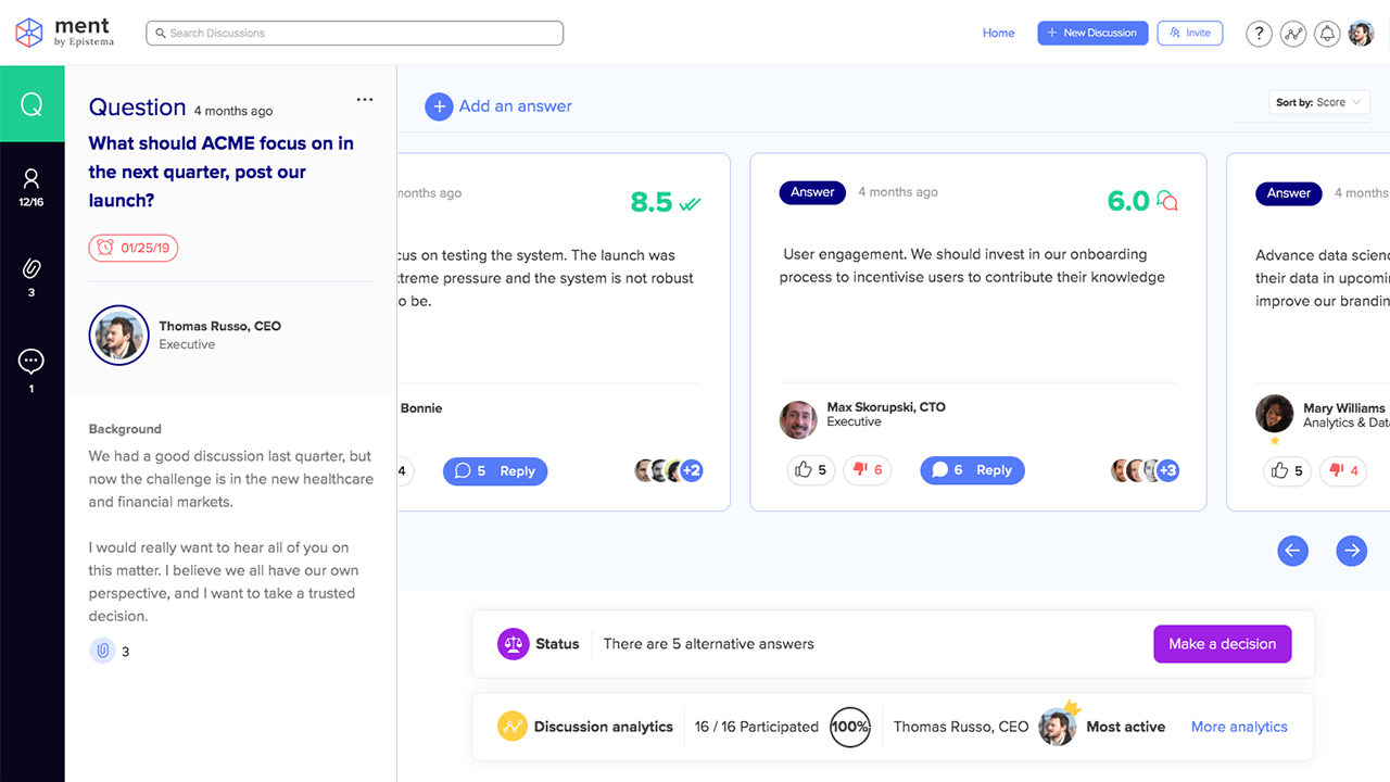 Ment by Epistema | N/A | Epistema, headquartered in Tel-Aviv, offers Ment, an AI-driven BI tool designed to integrate with a company's collaboration app (e.g. Slack) to provide better peer understanding and improve workplace decisions. | N/A |