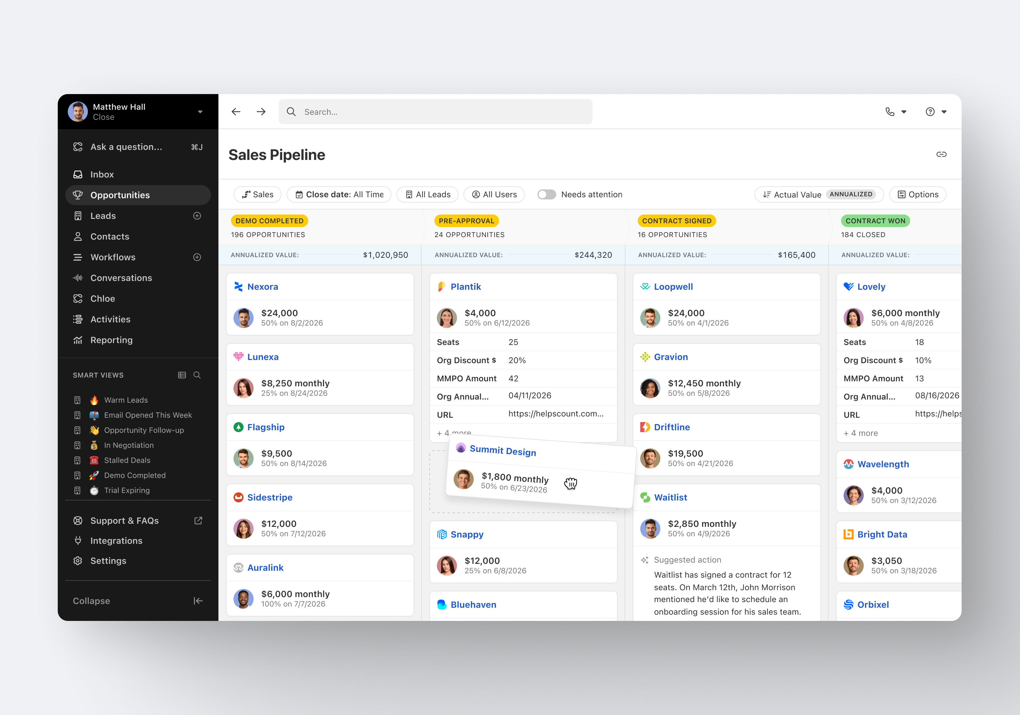 Pipedrive was great for us for a long time. We used it for over 4 years. Our product and process was simple. When things got more complex, we needed something that could handle our growing needs and Pipedrive kept falling short. We built our own custom solution in Airtable and though it worked, we spend a lot of time managing it. Close was able to solve all our issues and save us hours per week in admin work.