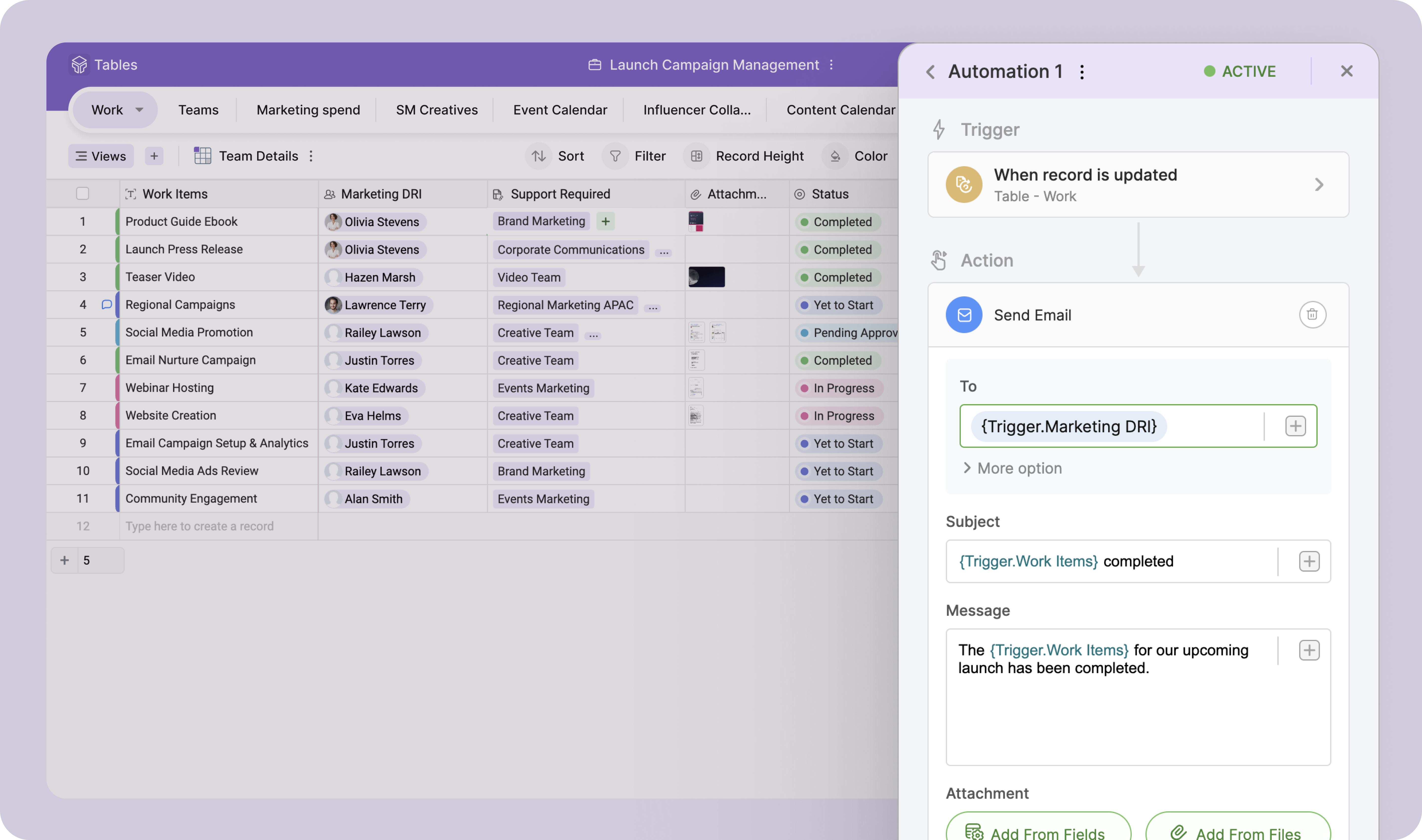 The best pre-made automations for Zoho Tables would be with all {} being user defined selections:
