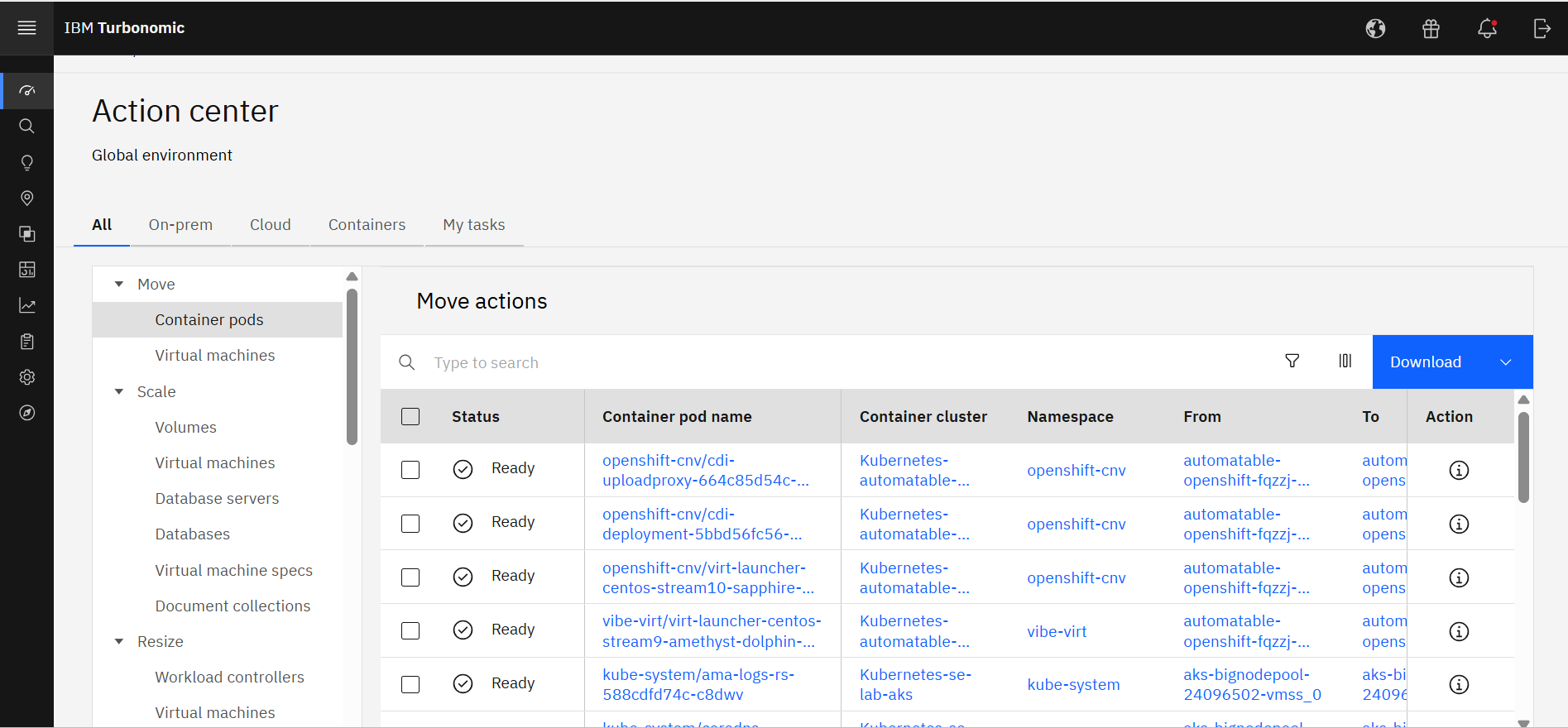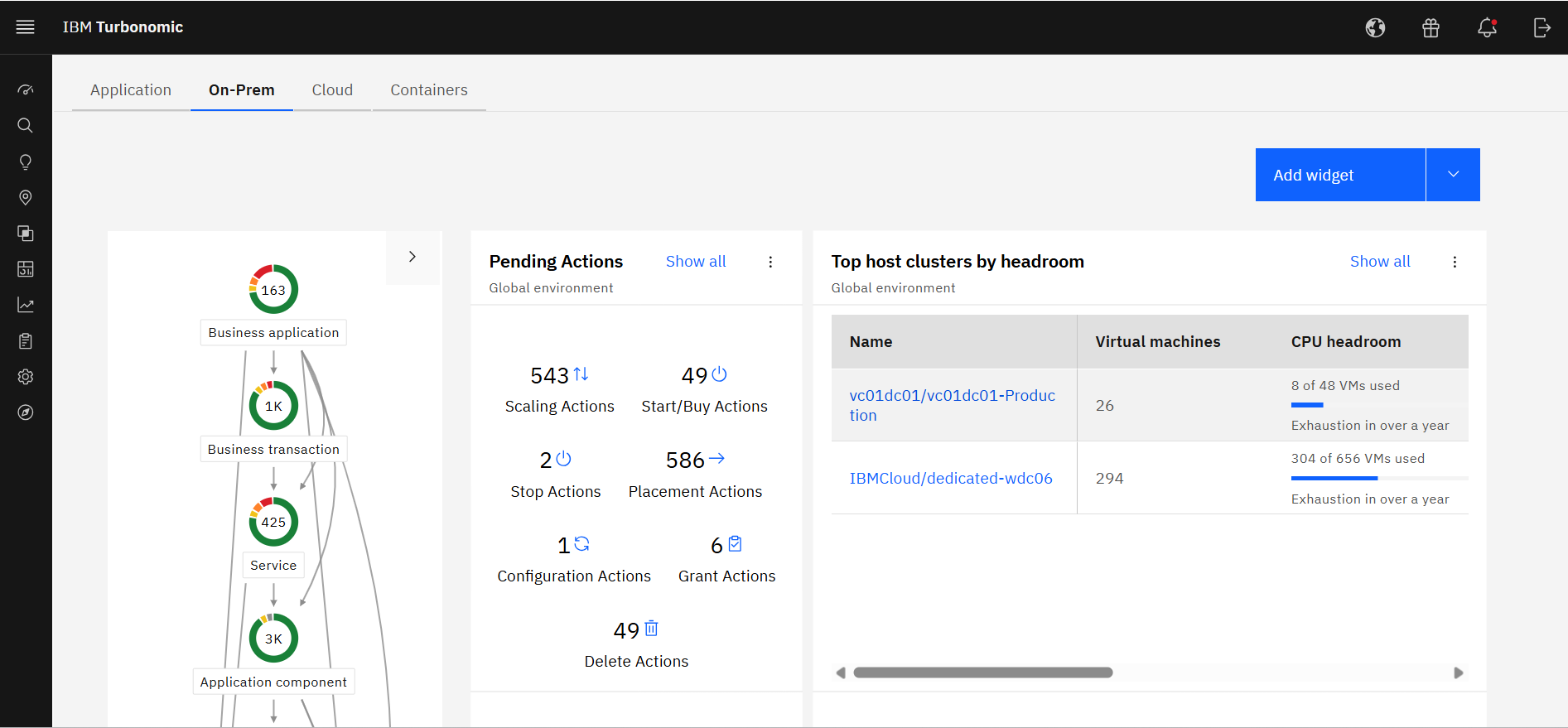Measure the usage of resources across different platforms, from Kubernetes to VMs on-premises or in the cloud, to obtain current capacity metrics and plan for future scenarios. Reduce IT infrastructure costs by taking automated actions based on resource underutilization, such as shutting down VMs or changing resource definitions.