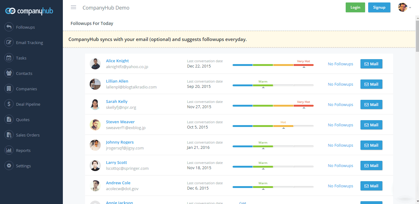 CompanyHub CRM | N/A | CompanyHub is a Fully Customizable CRM: CompanyHub goes beyond storing custom fields. You can also create custom tables to store any kind of data like Projects, Payments, Schools, Properties, Courses etc. Records from different tables can be associated. You can change the labels (like change ‘Company’ to ‘Hospital’), filter records by any criteria, change columns and do reporting on any table/field. According to the vendor, other capabilities include: Followup… | $19.99 per month, billed annually | |