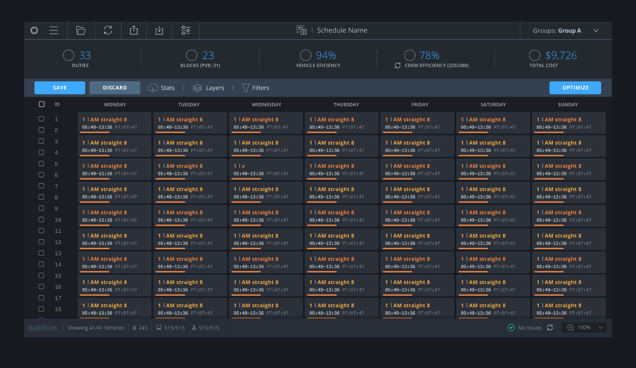 Optibus | N/A | Optibus is a unified software platform for public transportation planning and operations. Agencies and operators of cities worldwide can use Optibus to improve service quality and efficiency, promote transportation access and equity, reduce emissions and costs, and modernize their operations. | N/A |