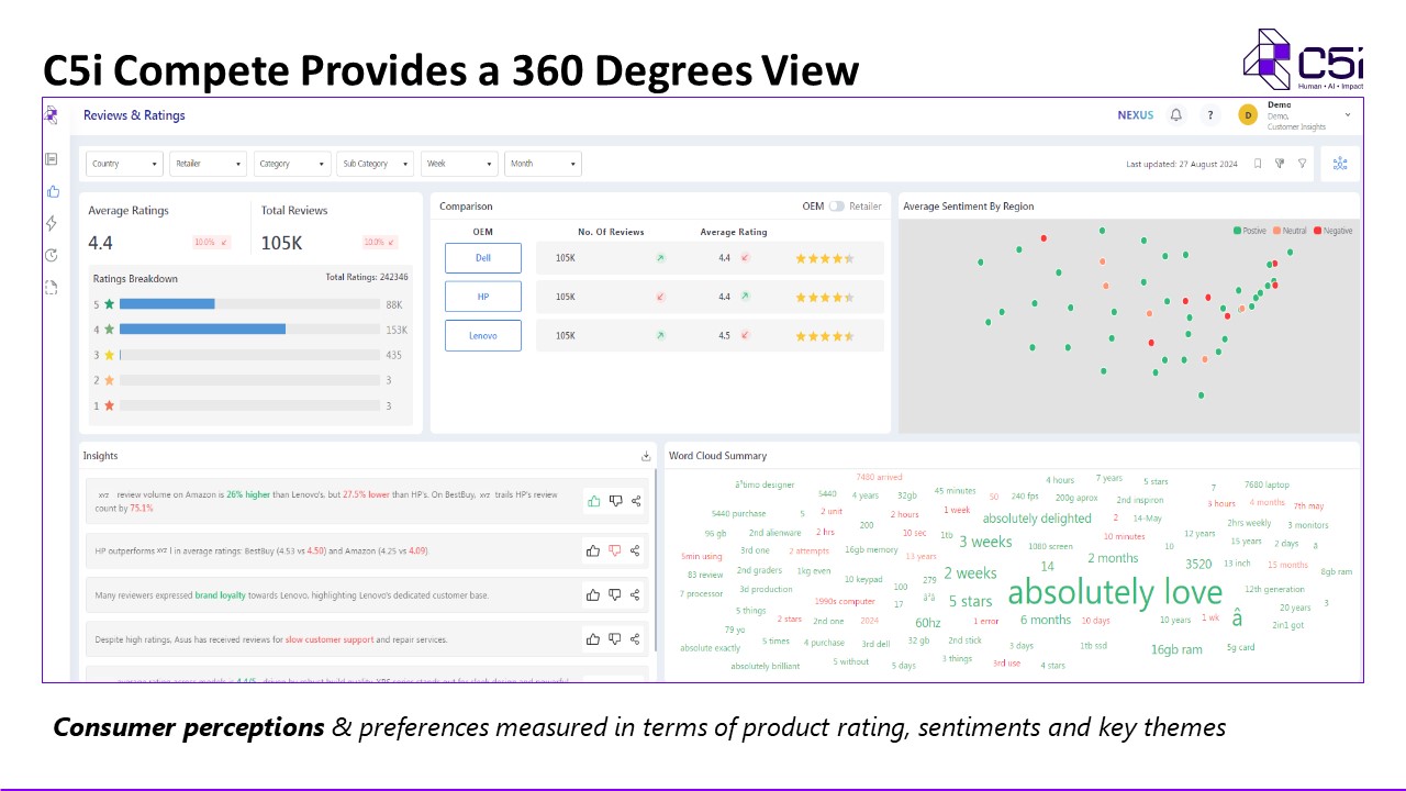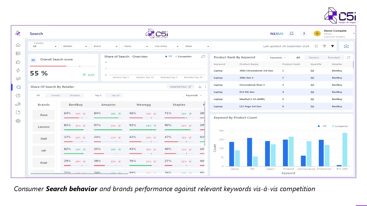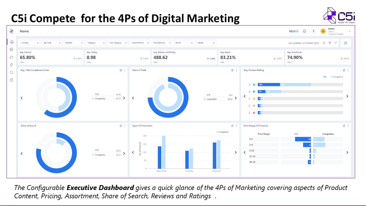 C5i Compete | Enterprise companies (1,001+ employees) | C5i Compete is a data source-agnostic, user persona-based enterprise-level Digital Shelf Analytics and Insights platform that delivers curated insights and actionable decision intelligence, ensuring organizations collaborate across silos to enhance their Digital Shelf and track/improve KPIs, with the goal of boosting their omnichannel sales and revenue. The platform's data engineering and automation capabilities delivers automated multi-geography and multi-language reports delivering insights… | N/A | |