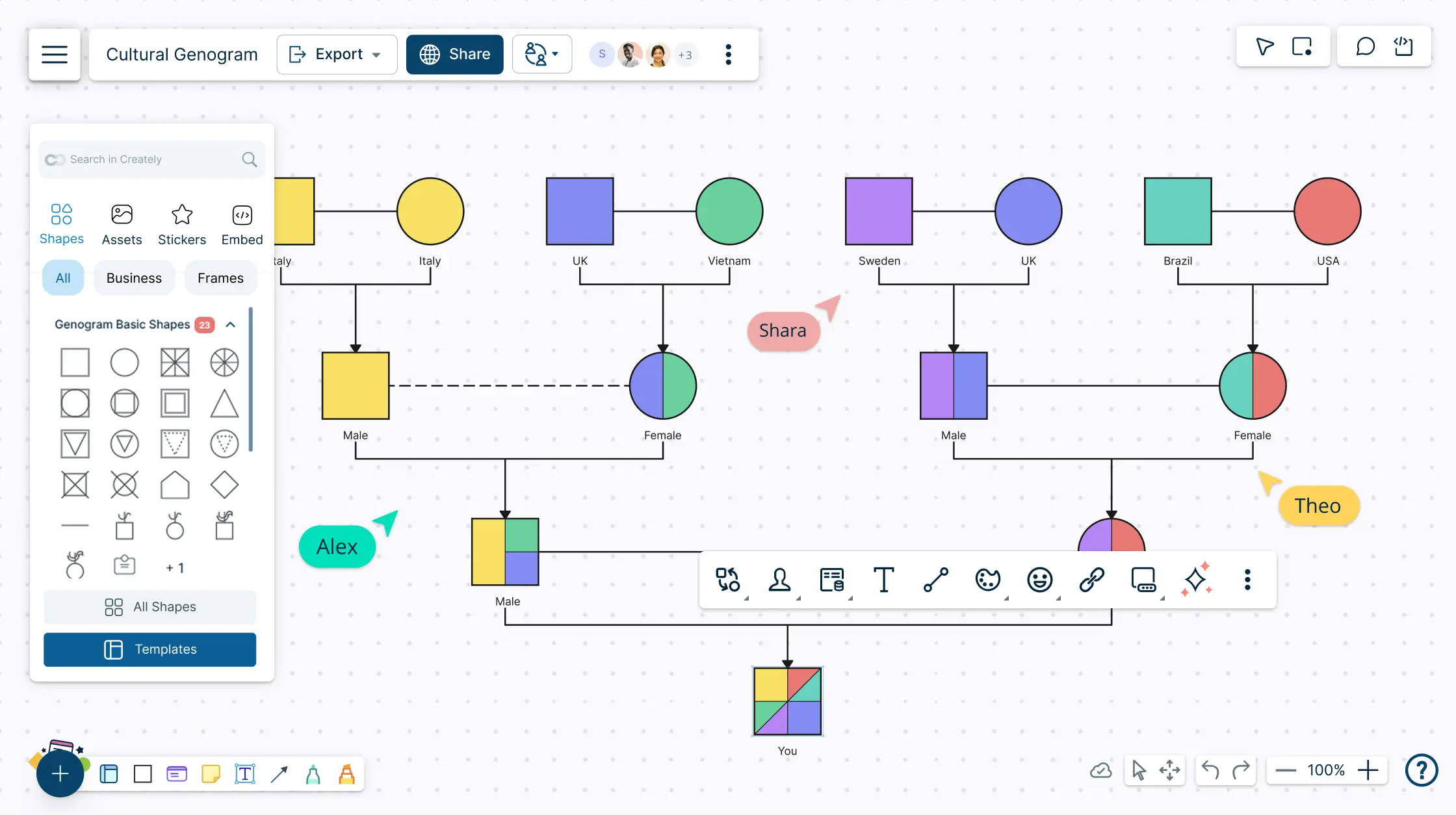 Creately | Small Businesses (1-50 employees) | Creately is a visual collaboration platform that supports genograms, flowcharts, org charts, mind maps, and UML diagrams. Featuring template-based AI diagram generation, Creately boasts speed and accuracy in visual planning. | $8 per month (single user) | |