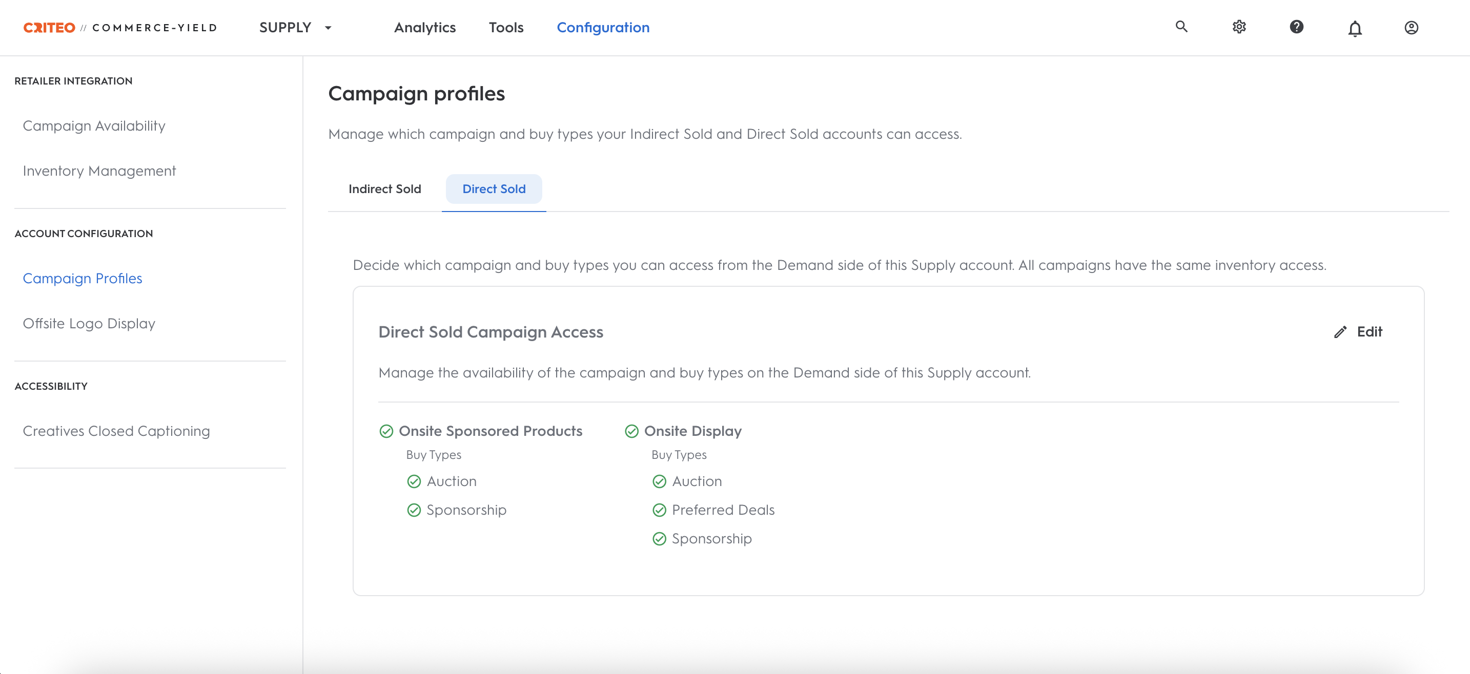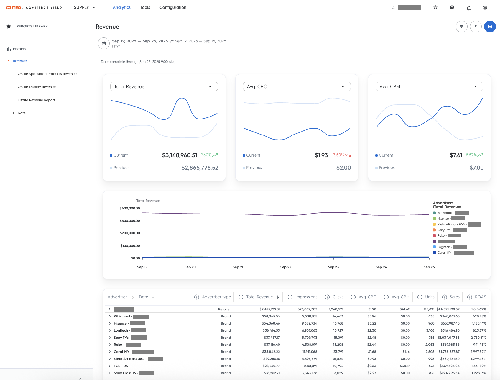 Criteo Commerce Yield | N/A | Commerce Yield is a monetization platform built for retailers and marketplaces to unlock new revenue streams from their digital properties and first-party data. With modular solutions (ranging from a white-label self-service platform to APIs), Commerce Yield powers direct demand while also improving incremental growth through brand, agency, and partner integrations. Commerce Yield’s retail media technology aims to ensure ad relevancy, optimize campaign performance, and deliver closed-loop… | N/A | |