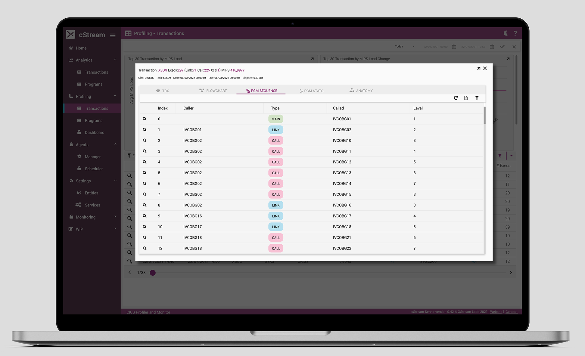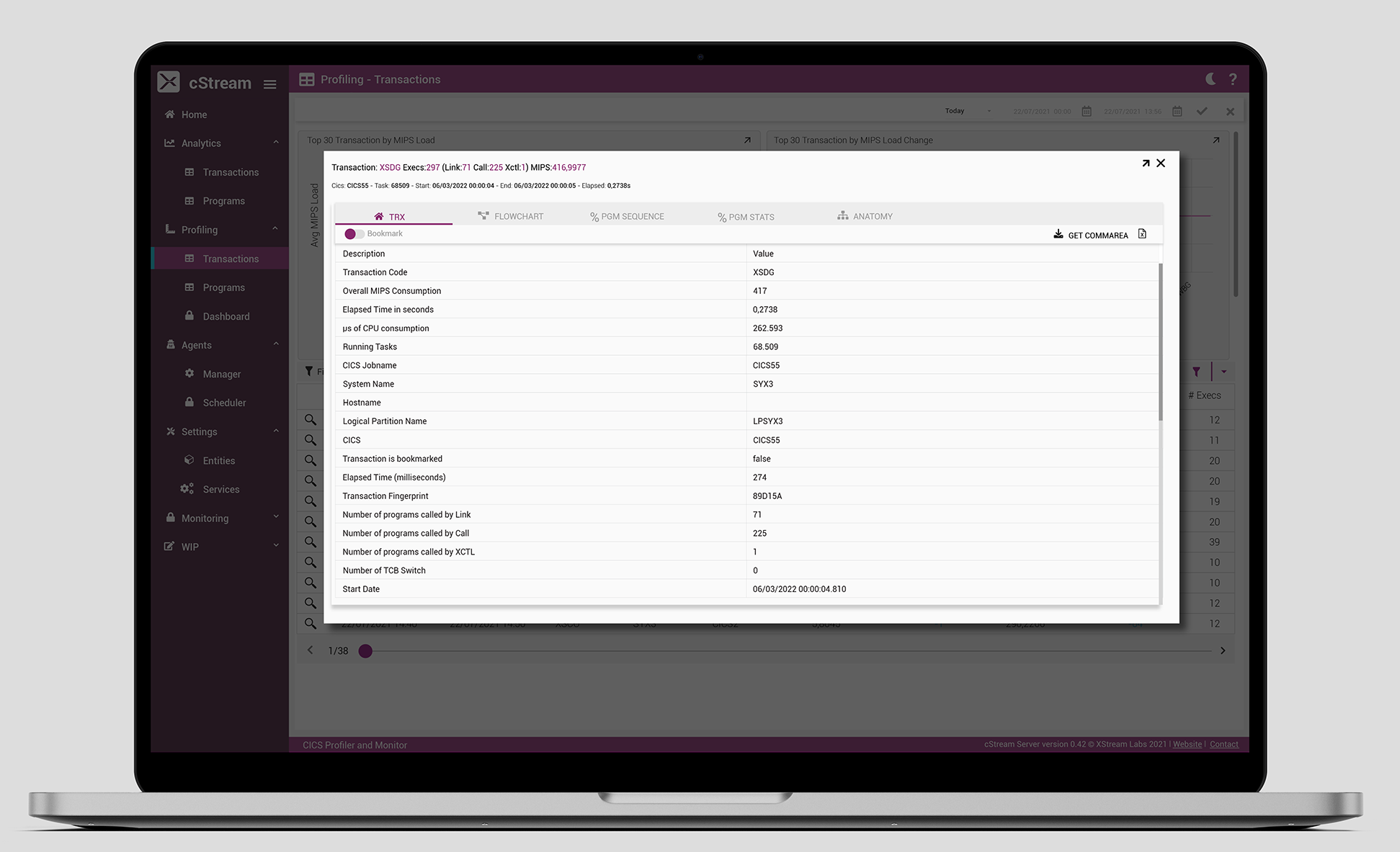 XStream cStream | N/A | cStream collects real-time performance and consumption statistics of transactional workloads. It is thus able to show information relating to what is really happening at the moment, without having to wait for extractions and re-elaborations that will take place the following day. Highlighting anomalous situations allows customers to obtain MIPS savings, to improve the efficiency of the applications and the quality of the software, in order to support the technical teams in… | N/A | |