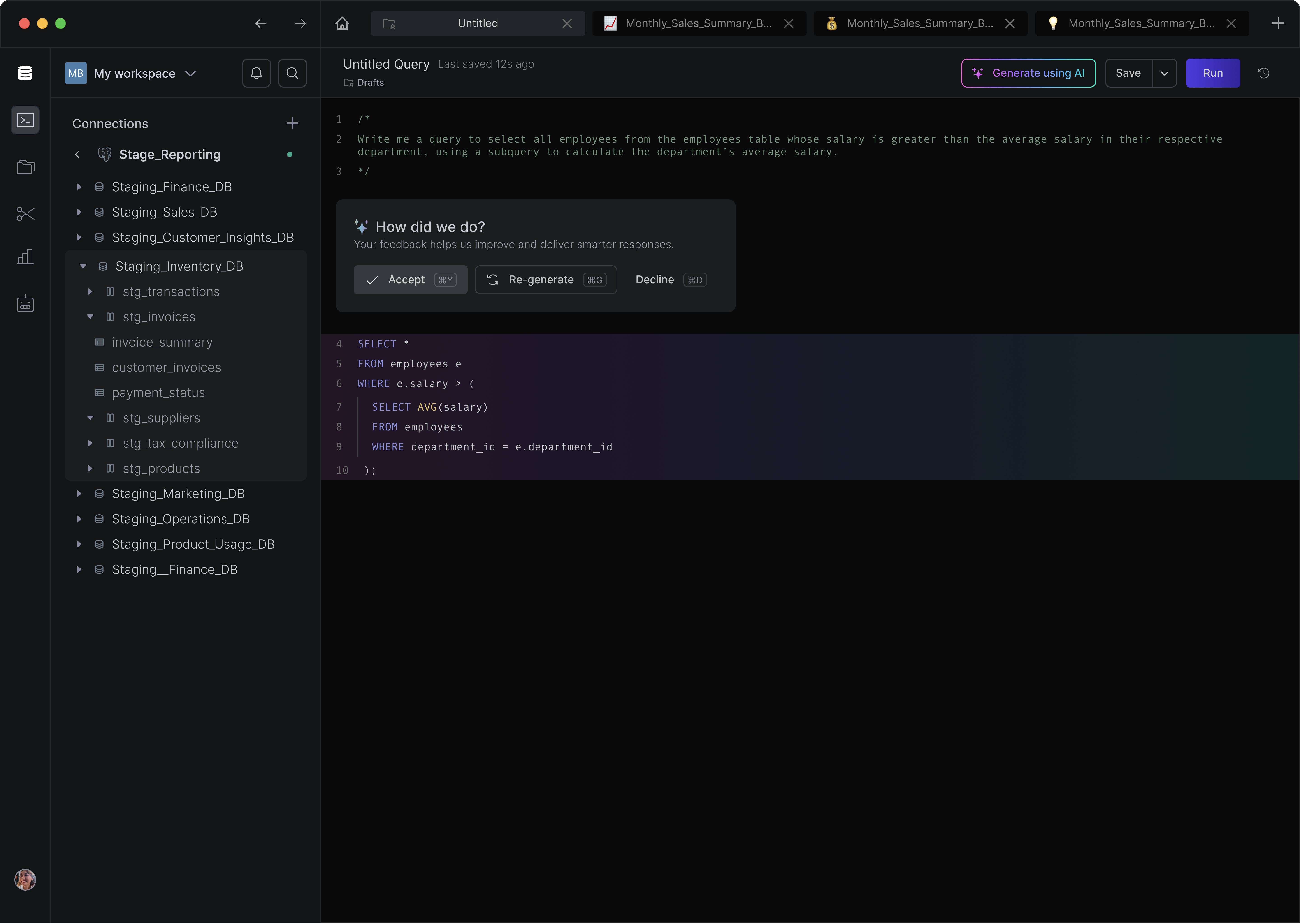 Galaxy | Small Businesses (1-50 employees) | Galaxy is presented as Cursor for software engineers and data practitioners, and as a modern SQL editor with features like an AI copilot, sharing and collaboration, as well as access control and security. Galaxy’s base product is a fast SQL editor with reworked parameterization, auto-complete, and table metadata to make data discovery and analysis more reliable and convenient for developers. Galaxy’s AI copilot is context-aware - meaning… | $0 per month per user |