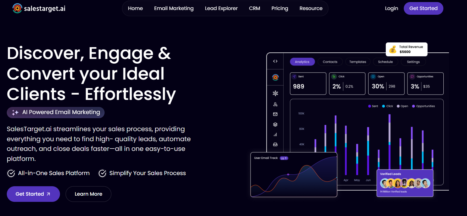 Salestarget.ai | N/A | SalesTarget.ai is a sales platform designed to help businesses generate leads, automate outreach, and close deals within a single, unified interface. Its key capabilities include: Verified B2B Lead Generation Includes a database of targeted contacts, filtered by industry, title, and location, for precise prospecting. Smart Cold Email Outreach Automates personalized email sequences with real-time tracking… | $30 per month per user |