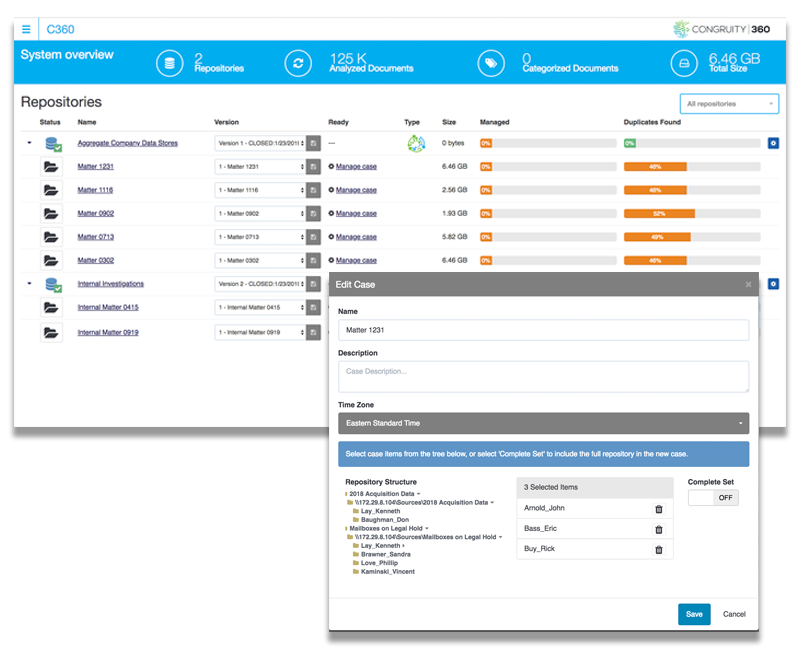 Discover360 | Enterprise companies (1,001+ employees) | Congruity360's eDiscovery suite aims to enable end-to-end litigation readiness by arming legal teams with the tools and relevant data to effectively perform eDiscovery in-house. The suite delivers a seamless eDiscovery workflow for legal holds, preservation, early case assessment, collections, and review in one system, says the vendor. According to the vendor, some of the benefits Congruity360 clients see include the ability to: Harness growing electronic data spread among a… | N/A | |