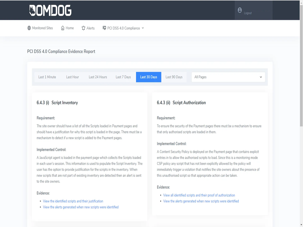 Domdog | N/A | Domdog is a solution for compliance with 6.4.3 and 11.6.1 requirements of PCI DSS 4.0.1. Every organization has different preferences and constraints regarding what new systems they can integrate into their payment pages. With this in mind, Domdog has been designed to support Remote Scanning, JavaScript Agent, and Content Security Policy. This helps to ensure that no matter what an organization's preferences are, Domdog can help them meet the 6.4.3 and 11.6.1 requirements with the… | N/A | |