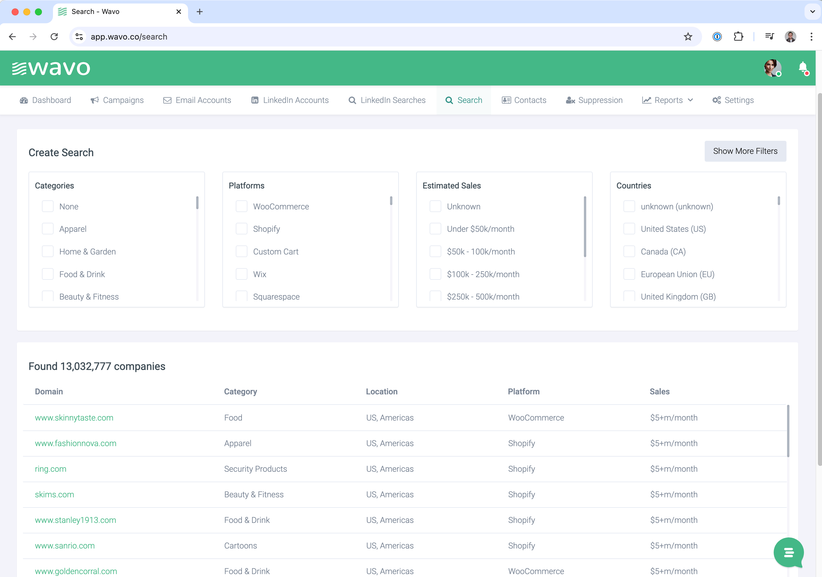 Wavo | N/A | Wavo empowers Agencies, SaaS, and 3PLs to accelerate sales growth by accessing untapped e-commerce leads, offering a real-time e-commerce contact database that boasts over 1.4 million verified decision-makers in the USA, updated monthly. Wavo services utilize proprietary web crawling and public records, to provide greater market coverage than generic databases. Wavo's integration with OpenAI’s ChatGPT enables the user to craft personalized emails at scale, to get… | N/A |