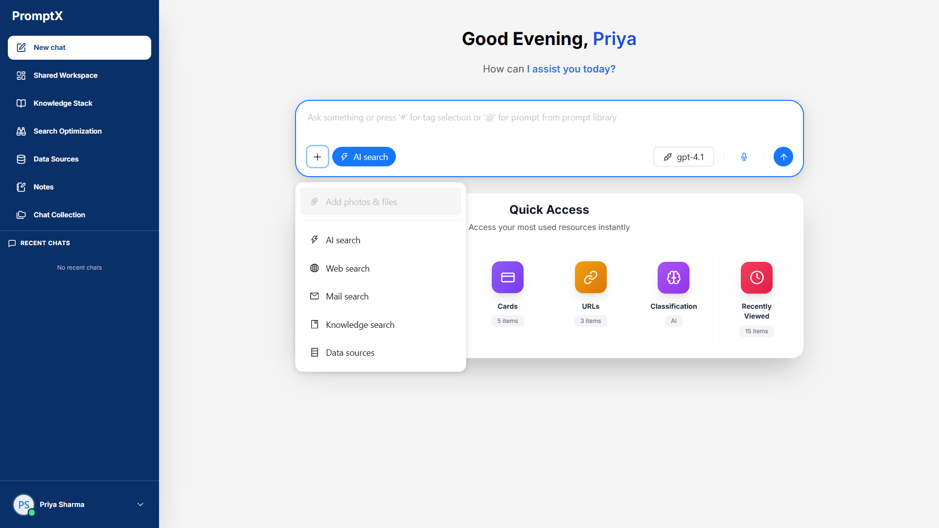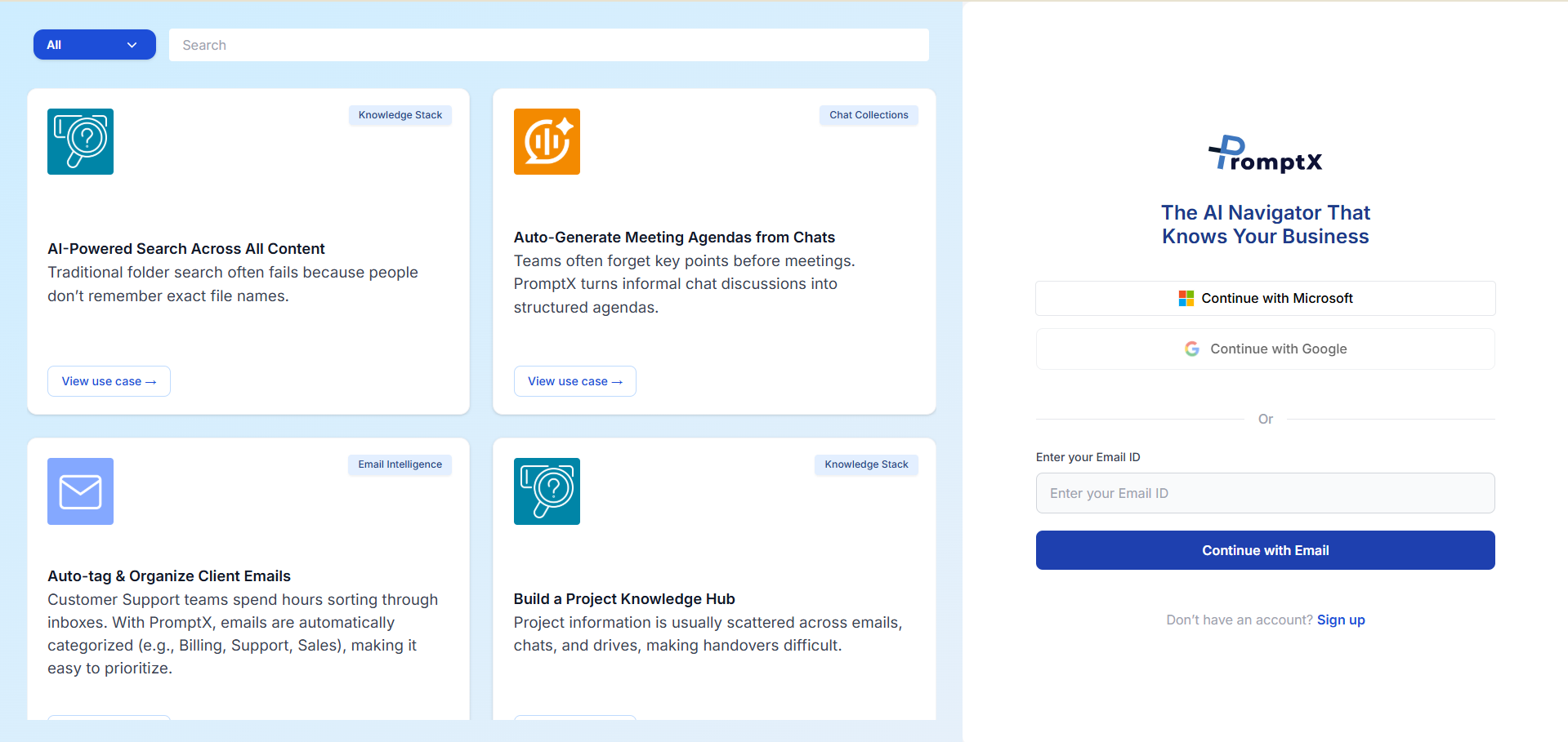 PromptX unifies data across SharePoint, Google Drive, email, cloud, and legacy systems into a single Enterprise Knowledge System. With AI-Powered Search, users ask conversational questions and get context-aware, verifiable answers in seconds.