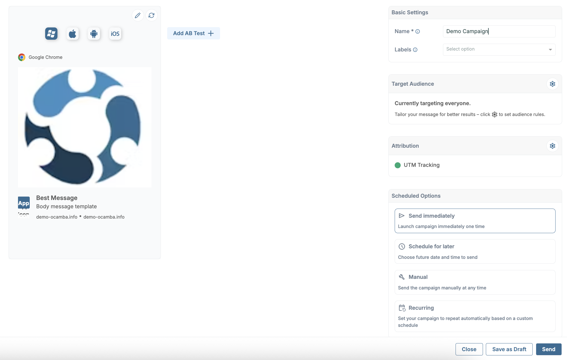 Ocamba | N/A | Ocamba is a customer engagement platform that helps businesses boost conversions, capture leads, and re-engage visitors. Push Notifications Re-engage users even after they leave a site with web and mobile push notifications. Instant delivery, no inbox competition. Track push subscribers, allows, and prompt performance in real-time. Simplified setup with WordPress and Shopify plugins or simple code installation. Modal Pop… | $19 per month |