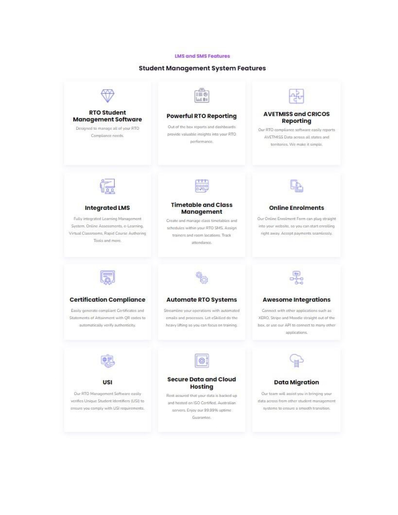 eSkilled SMS | N/A | eSkilled SMS is a student management system designed to help registered training organisations manage their student data and communications. It is presented as an ideal solution for training providers looking to streamline their administrative tasks and improve communication with students. Features eSkilled SMS eases training providers’ daily operations and makes compliance easier to maintain with its features: RTO Reporting AVETMISS and CRICOS… | N/A | |