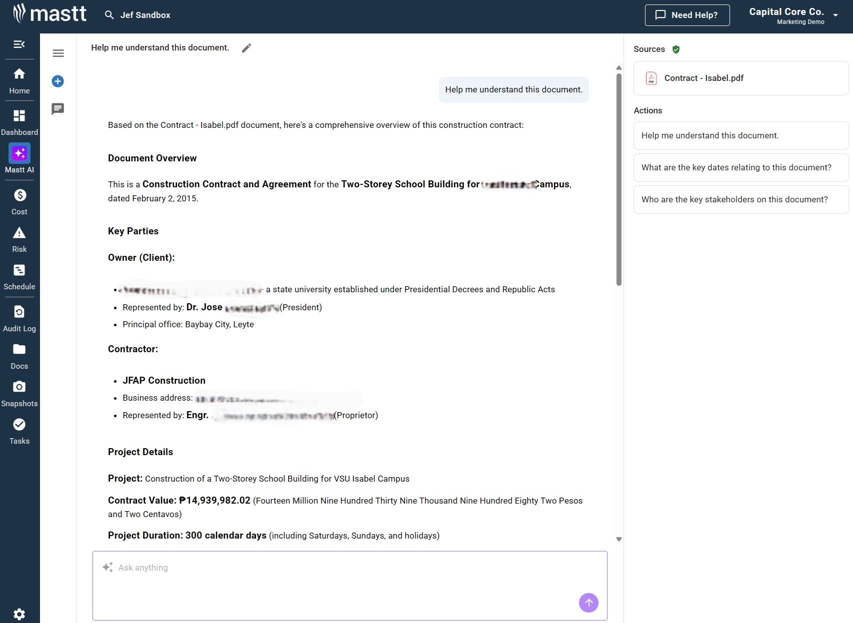 Mastt | N/A | Mastt is an Australian technology company founded in 2019 that develops construction project management software. The platform is designed for project owners, managers, consultants, and administrators who need real-time visibility across complex construction portfolios. Mastt centralizes project controls for costs, risks, schedules, contracts, and reporting. Mastt's AI features automate manual data entry, compliance checks, and reporting, cutting administrative… | $150 per month per project |