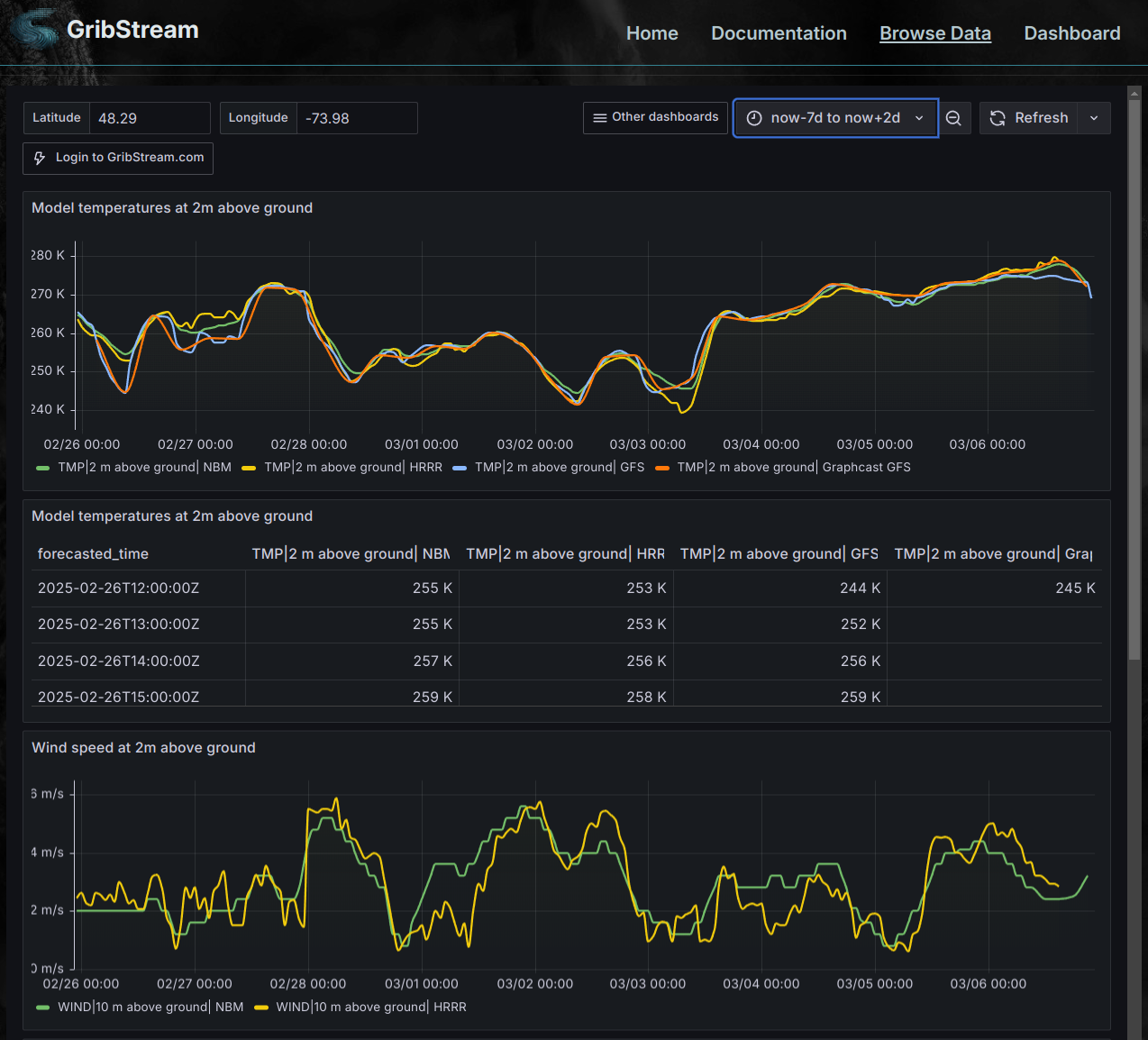 GribStream.com | N/A | GribStream.com offers access to historical weather data and forecasts through an efficient API. It's built for meteorologists, researchers, and anyone needing reliable weather data. Features include: A free tier for getting started Full history of weather forecasts State of the art weather models like the National Blend of Models (NBM), the Global Forecast System (GFS) and the Rapid Refresh (RAP) models. Timeseries… | N/A |