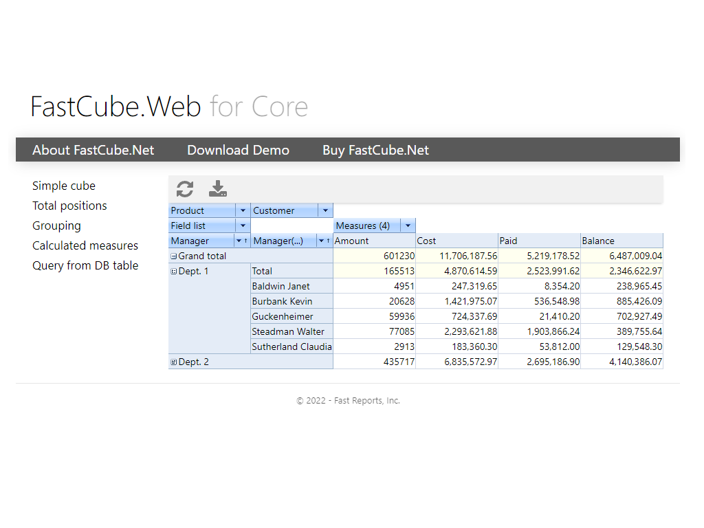 FastCube | N/A | FastCube enables users to analyze data and to build summary tables (data slices) as well as create a variety of reports and graphs. It's presented as a handy tool for the efficient analysis of data arrays. FastCube is a set of OLAP Desktop components. It supports .NET Framework 4, ASP .NET Core, Mono Framework. FastCube components can be built into the interface of host applications. FastCube end users do not require high programming skills to… | $199 per user | |