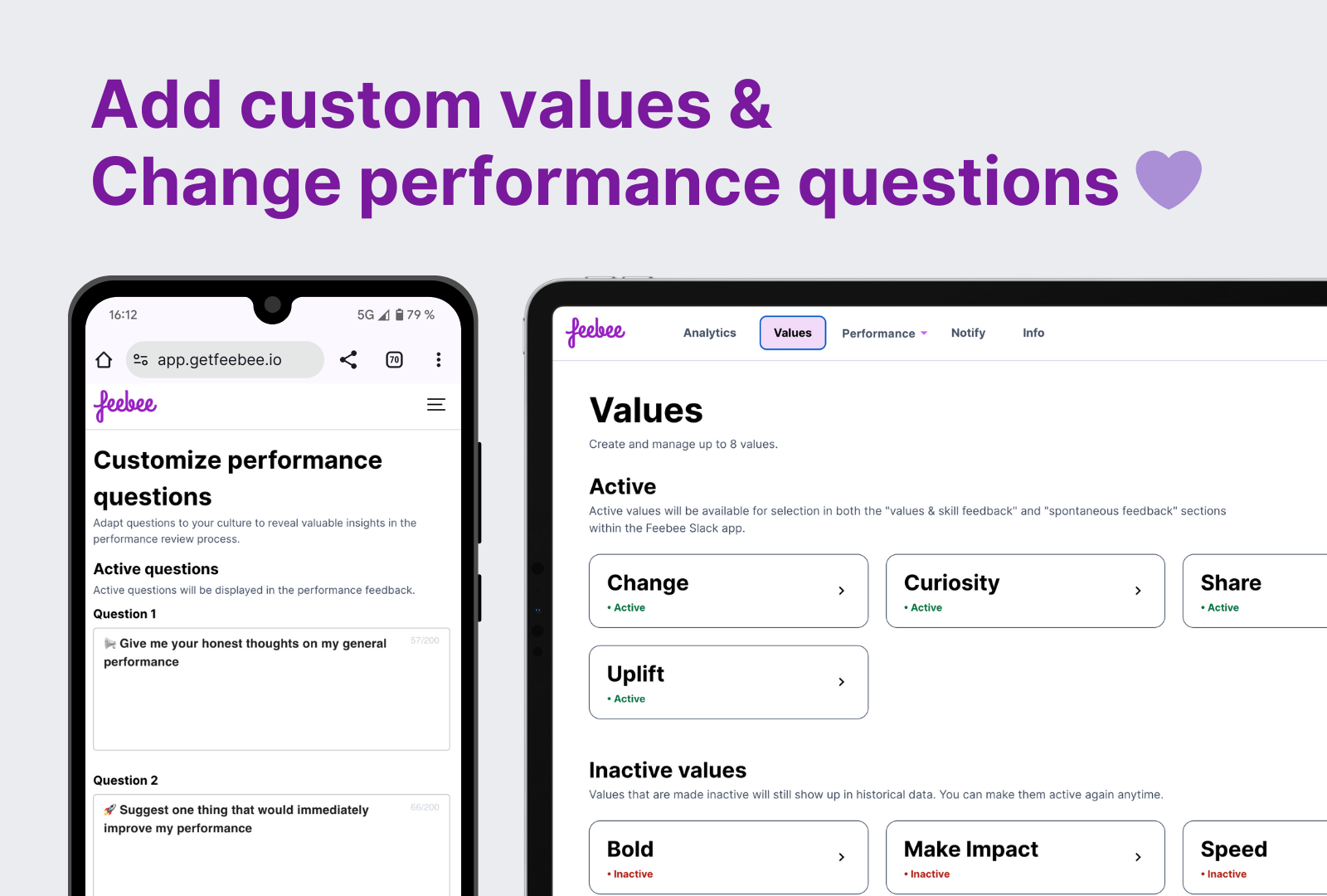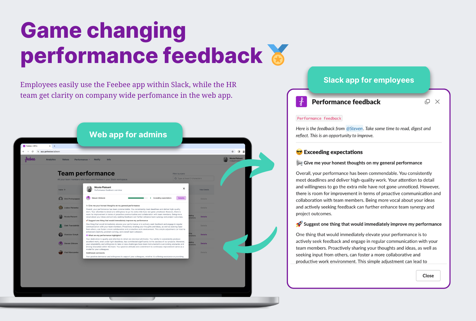 Feebee | Small Businesses (1-50 employees) | Feebee integrates with Slack to support the organization's feedback culture. Its features include 360° Performance Reviews, Appraisals, Recognition, and eNPS. Feebee ultimately is designed to simplify feedback processes and elevate employee engagement. | $99 per month | |